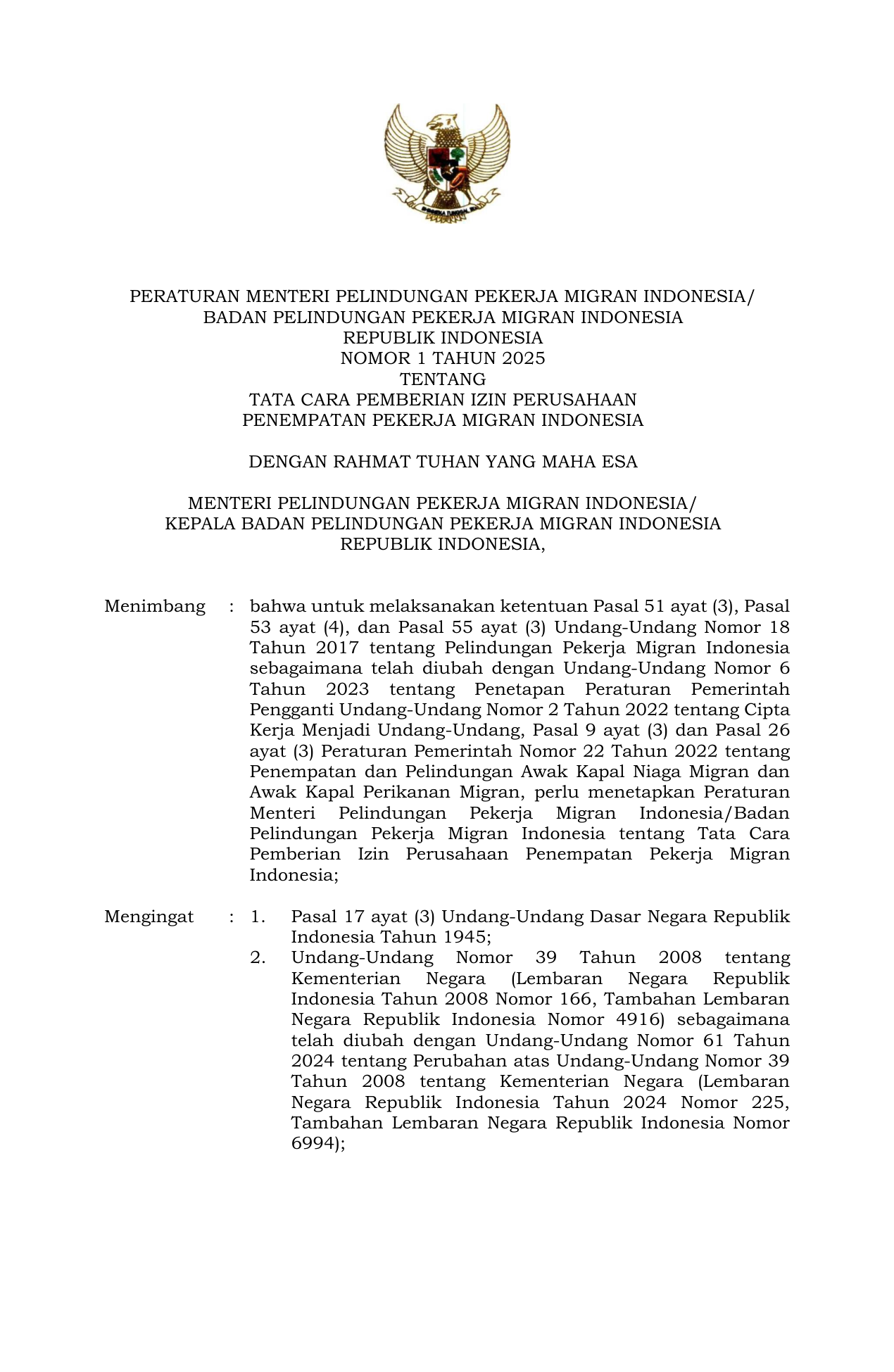 PERMEN Nomor 1 Tahun 2025 | Peraturan Menteri Nomor 1 Tahun 2025 tentang Tata Cara Pemberian Izin Perusahaan Penempatan Pekerja Migran Indonesia