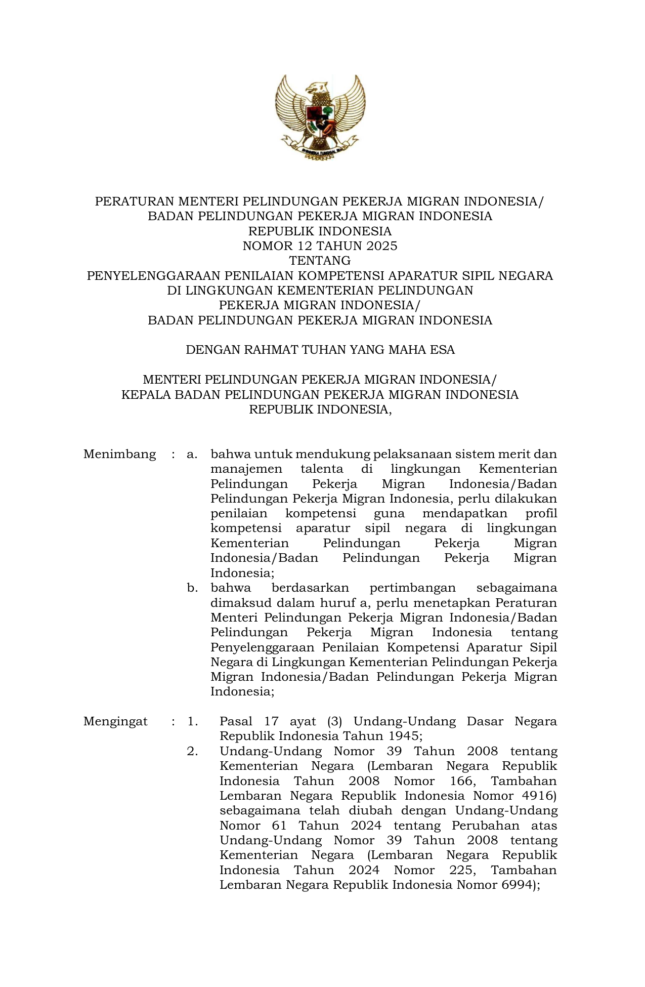 PERMEN Nomor 12 Tahun 2025 | Peraturan Menteri Nomor 12 Tahun 2025 tentang Penyelenggaraan Penilaian Kompetensi Aparatur Sipil Negara di Lingkungan Kementerian Pelindungan Pekerja Migran Indonesia Badan Pelindungan Pekerja Migran Indonesia