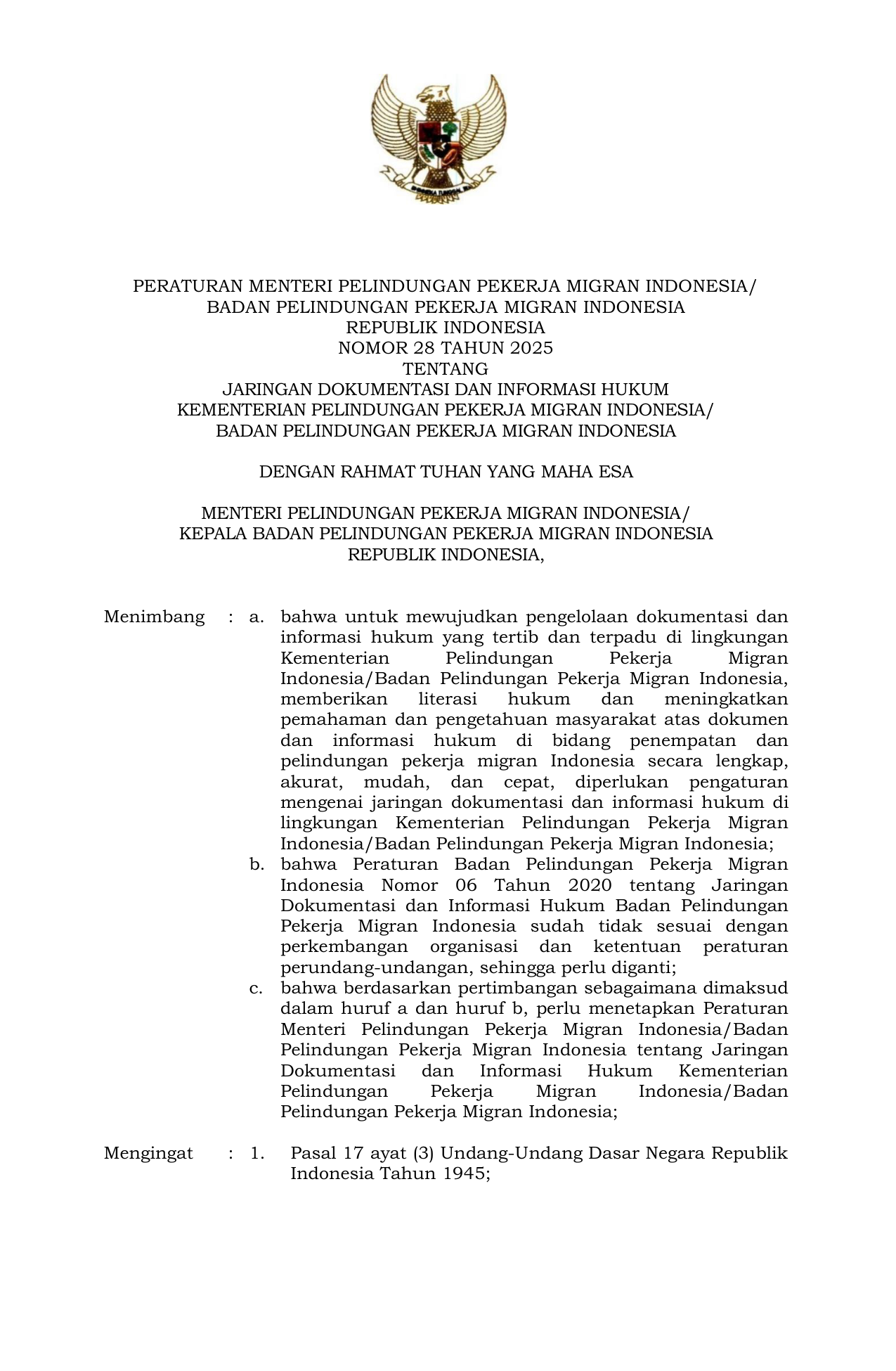 PERMEN Nomor 28 Tahun 2025 | Peraturan Menteri Nomor 28 Tahun 2025 tentang Jaringan Dokumentasi dan Informasi Hukum Kementerian Pelindungan Pekerja Migran Indonesia Badan Pelindungan Pekerja Migran Indonesia