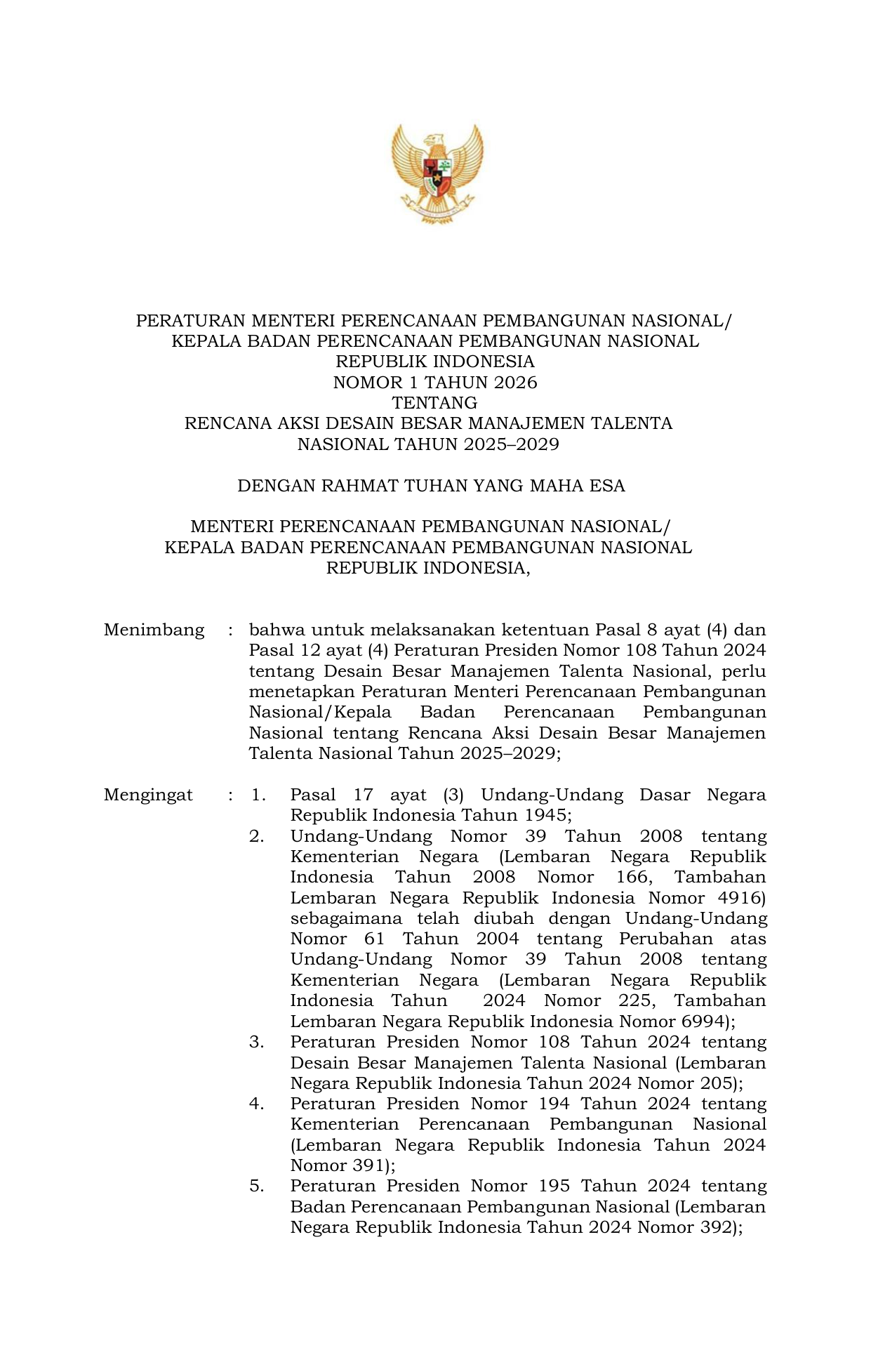 PERMEN Nomor 1 Tahun 2026 | Peraturan Menteri Nomor 1 Tahun 2026 tentang Rencana Aksi Desain Besar Manajemen Talenta Nasional Tahun 2025 2029