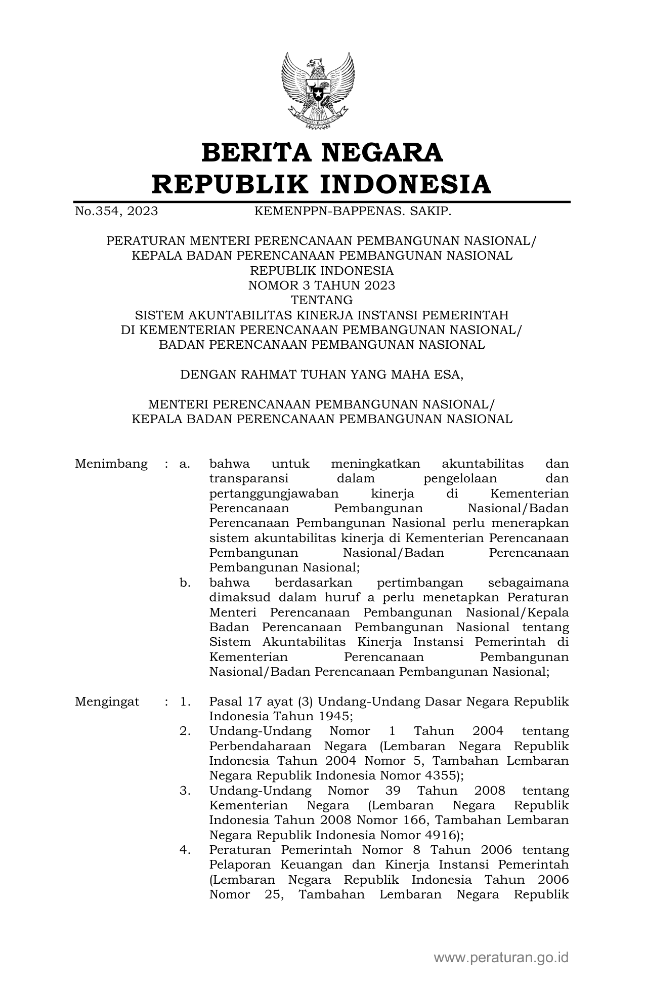 PERMEN Nomor 3 Tahun 2023 | Peraturan Menteri Nomor 3 Tahun 2023 tentang SISTEM AKUNTABILITAS KINERJA INSTANSI PEMERINTAH DI KEMENTERIAN PERENCANAAN PEMBANGUNAN NASIONAL/BADAN PERENCANAAN PEMBANGUNAN NASIONAL