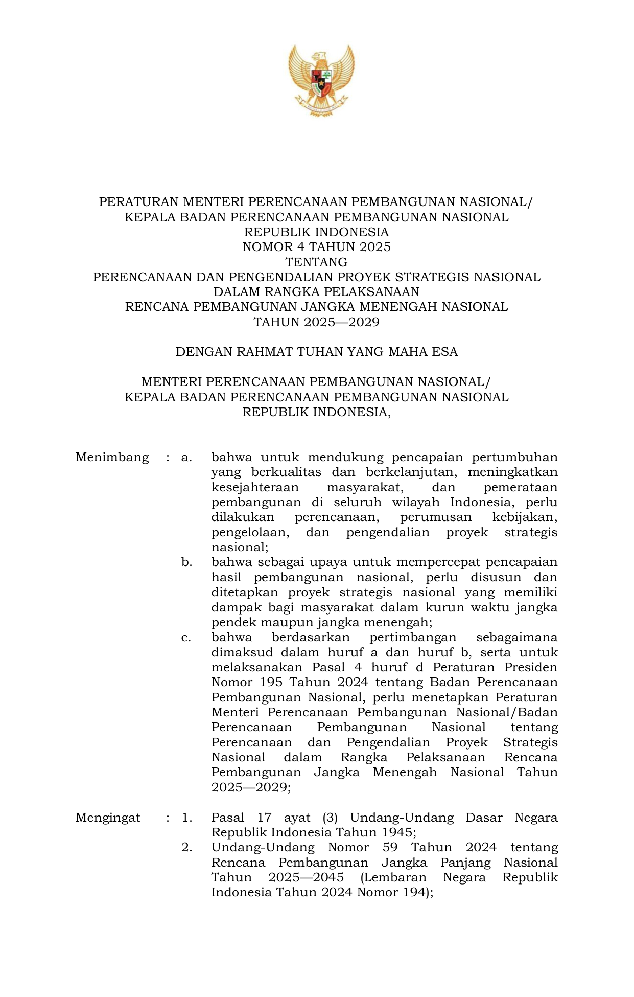 PERMEN Nomor 4 Tahun 2025 | Peraturan Menteri Nomor 4 Tahun 2025 tentang Perencanaan dan Pengendalian Proyek Strategis Nasional dalam Rangka Pelaksanaan Rencana Pembangunan Jangka Menengah Nasional Tahun 2025 2029