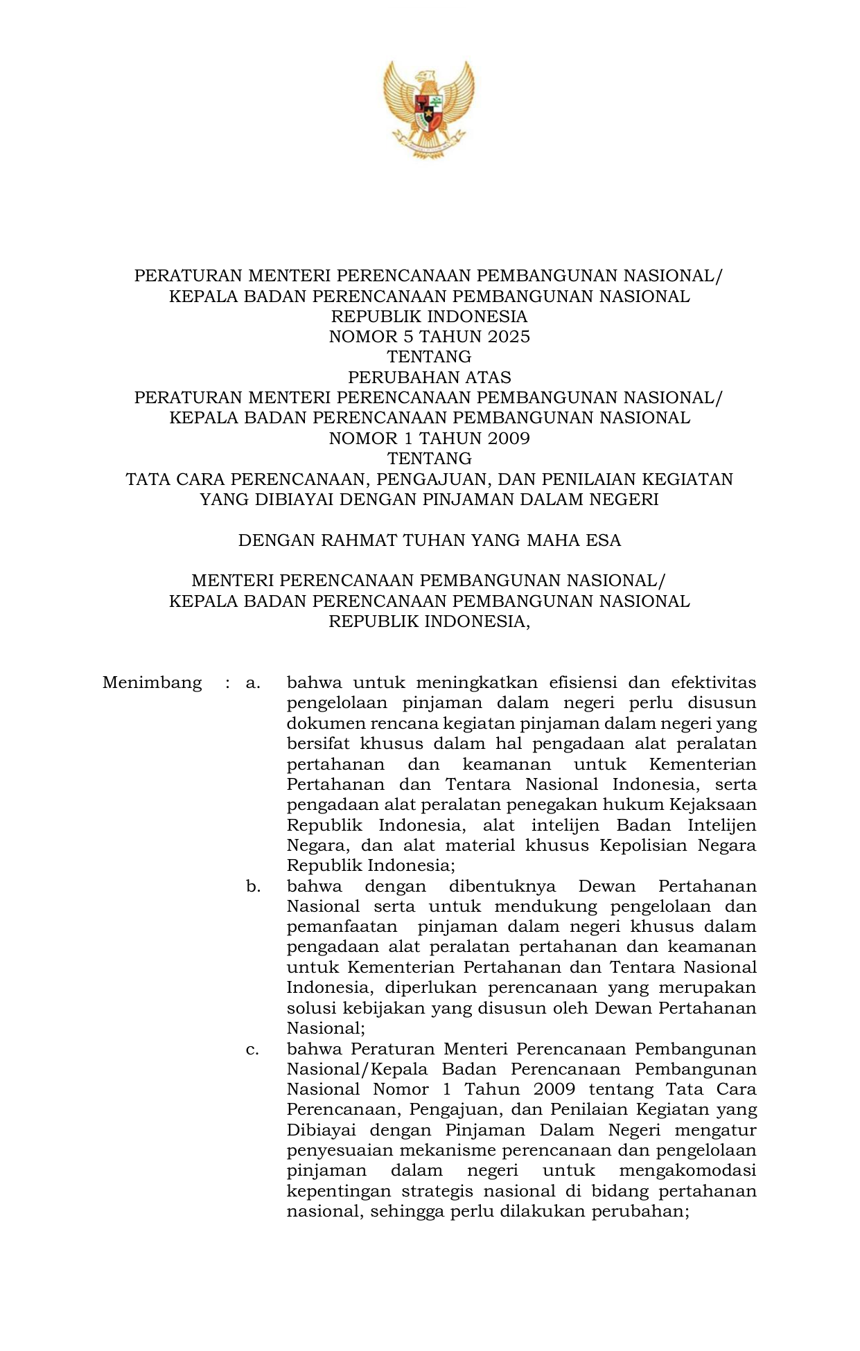 PERMEN Nomor 5 Tahun 2025 | Peraturan Menteri Nomor 5 Tahun 2025 tentang Perubahan atas Peraturan Menteri Perencanaan Pembangunan Nasional Kepala Badan Perencanaan Pembangunan Nasional Nomor 1 Tahun 2009 tentang Tata Cara Perencanaan Pengajuan dan Penilaian Kegiatan yang Dibiayai dengan Pinjaman Dalam Negeri