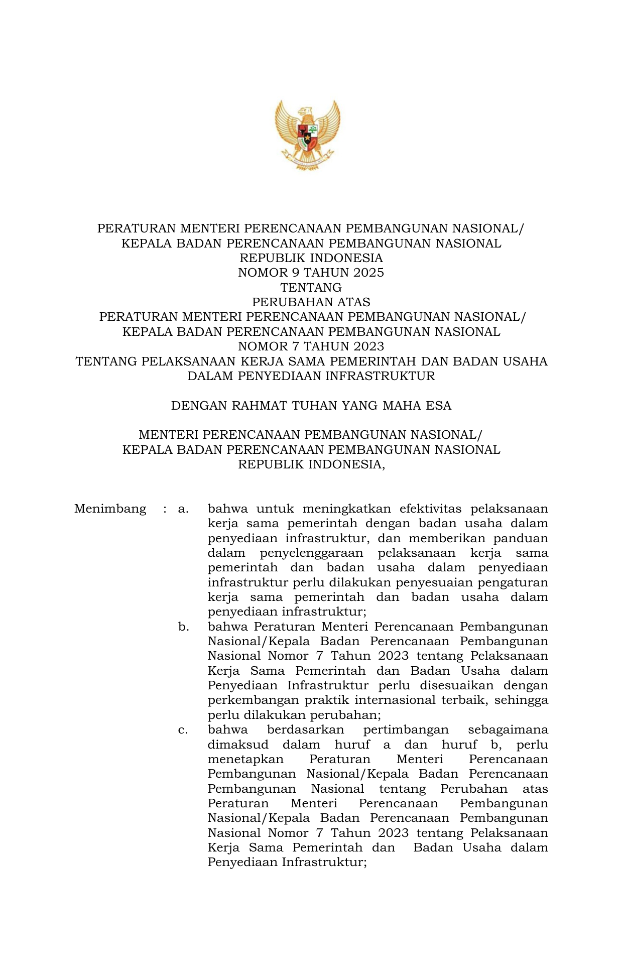 PERMEN Nomor 9 Tahun 2025 | Peraturan Menteri Nomor 9 Tahun 2025 tentang Perubahan atas Peraturan Menteri Perencanaan Pembangunan Nasional Kepala Badan Perencanaan Pembangunan Nasional Nomor 7 Tahun 2023 tentang Pelaksanaan Kerja Sama Pemerintah dan Badan Usaha dalam Penyediaan Infrastruktur