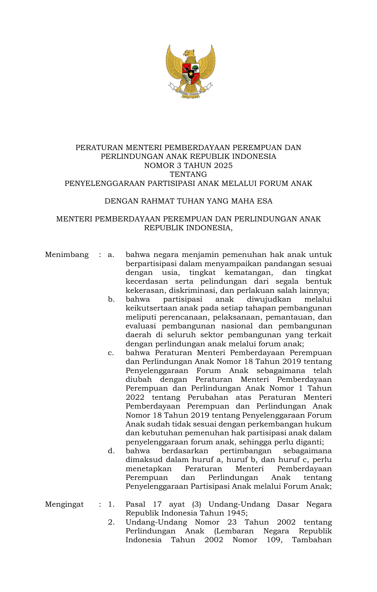 PERMEN Nomor 3 Tahun 2025 | Peraturan Menteri Nomor 3 Tahun 2025 tentang Penyelenggaraan Partisipasi Anak Melalui Forum Anak