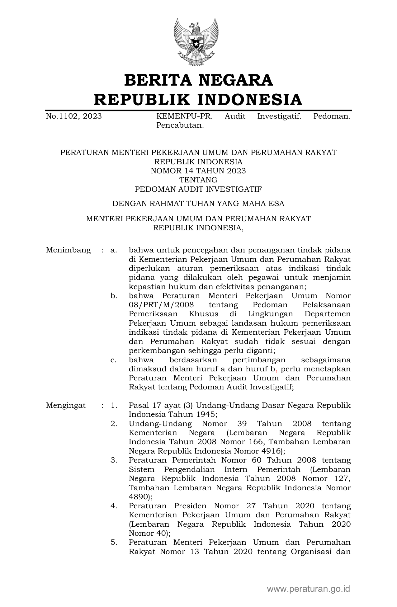 PERMEN Nomor 14 Tahun 2023 | Peraturan Menteri Nomor 14 Tahun 2023 tentang PEDOMAN AUDIT INVESTIGATIF