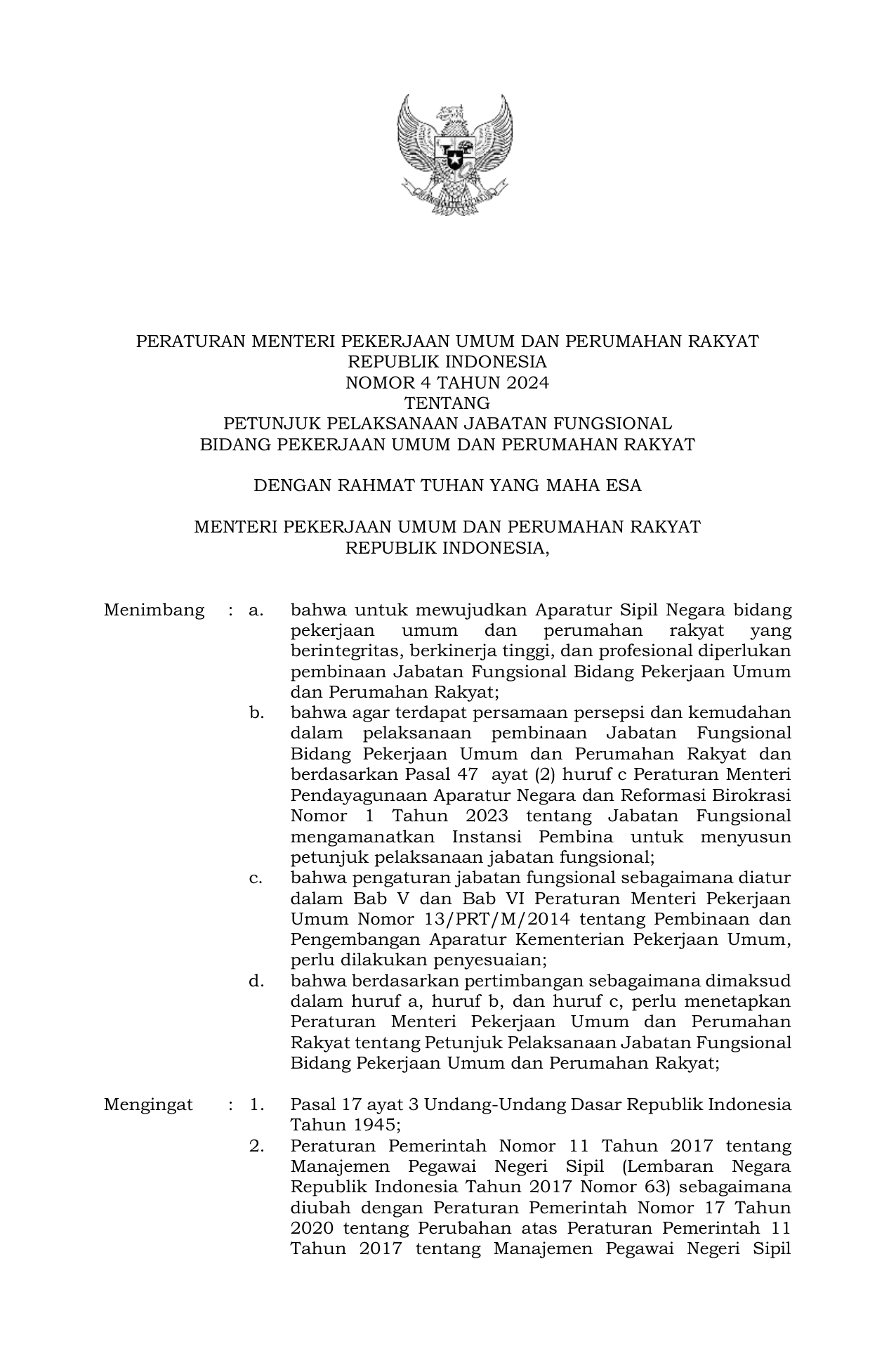 PERMEN Nomor 4 Tahun 2024 | Peraturan Menteri Nomor 4 Tahun 2024 tentang PETUNJUK PELAKSANAAN JABATAN FUNGSIONAL BIDANG PEKERJAAN UMUM DAN PERUMAHAN RAKYAT