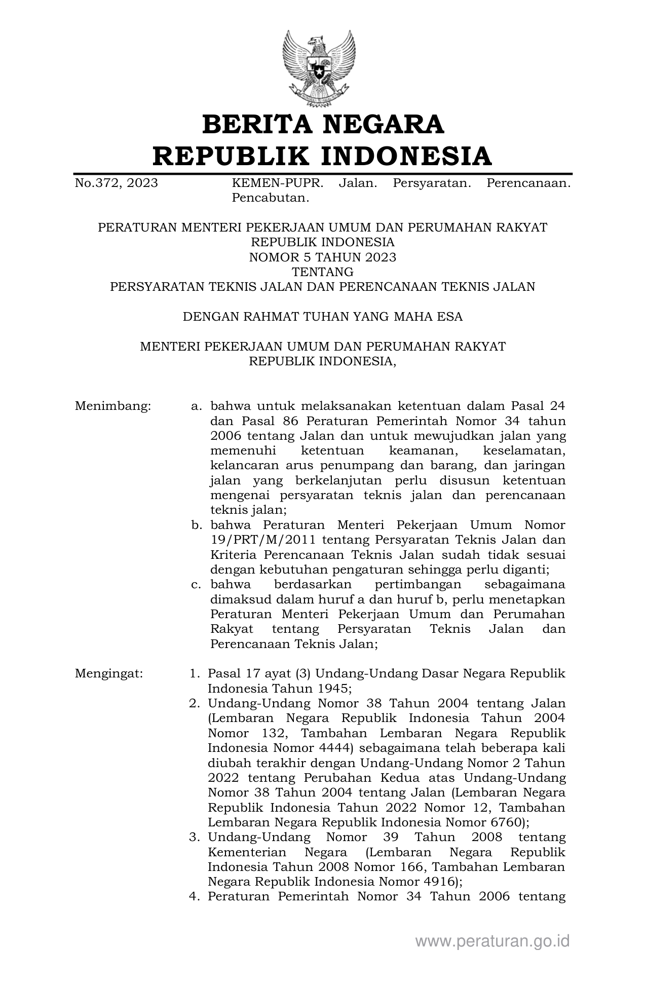 PERMEN Nomor 5 Tahun 2023 | Peraturan Menteri Nomor 5 Tahun 2023 tentang PERSYARATAN TEKNIS JALAN DAN PERENCANAAN TEKNIS JALAN