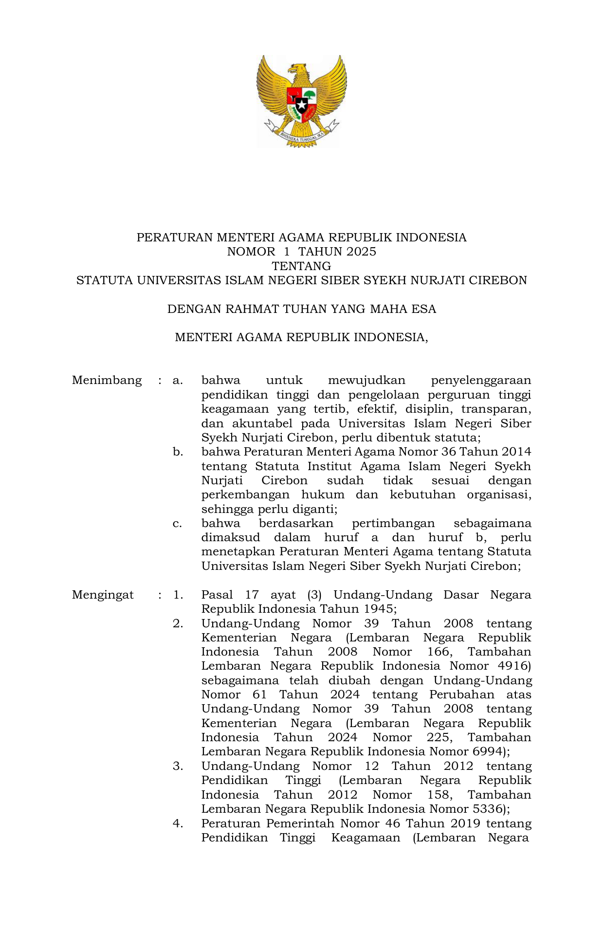 PERMEN Nomor 1 Tahun 2025 | Peraturan Menteri Nomor 1 Tahun 2025 tentang Statuta Universitas Islam Negeri Siber Syekh Nurjati Cirebon