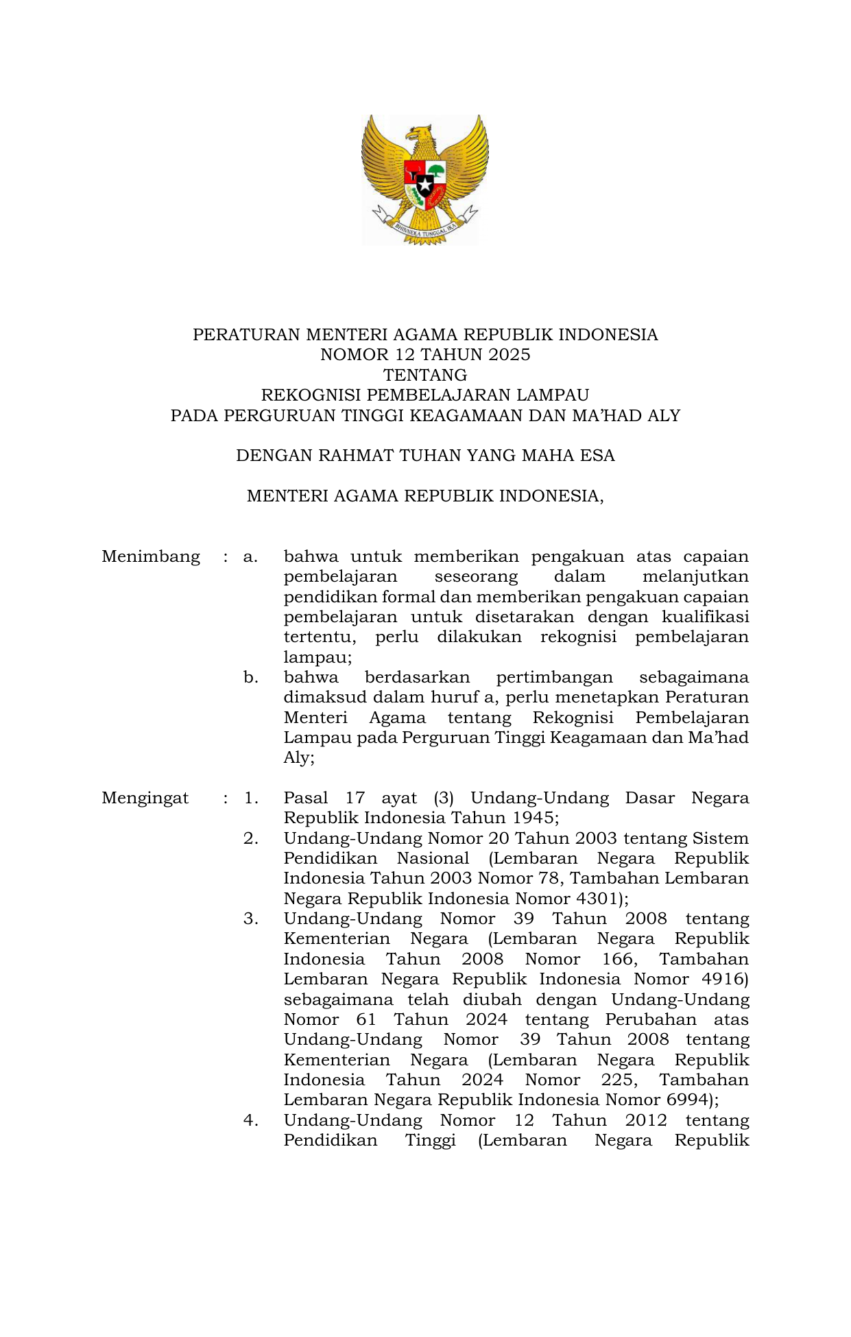 PERMEN Nomor 12 Tahun 2025 | Peraturan Menteri Nomor 12 Tahun 2025 tentang Rekognisi Pembelajaran Lampau pada Perguruan Tinggi Keagamaan dan Mahad Aly