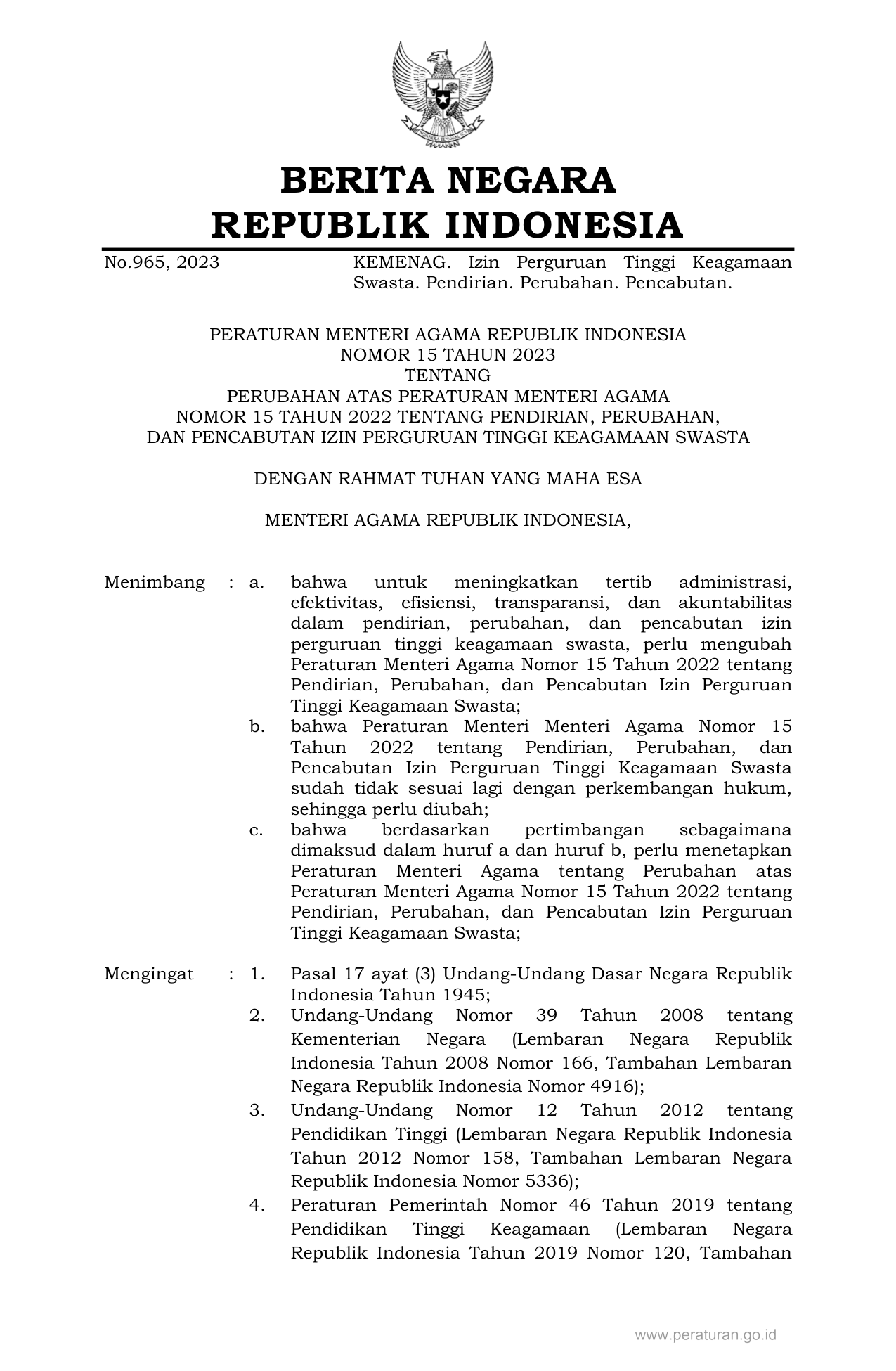 PERMEN Nomor 15 Tahun 2023 | Peraturan Menteri Nomor 15 Tahun 2023 tentang PERUBAHAN ATAS PERATURAN MENTERI AGAMA NOMOR 15 TAHUN 2022 TENTANG PENDIRIAN, PERUBAHAN, DAN PENCABUTAN IZIN PERGURUAN TINGGI KEAGAMAAN SWASTA