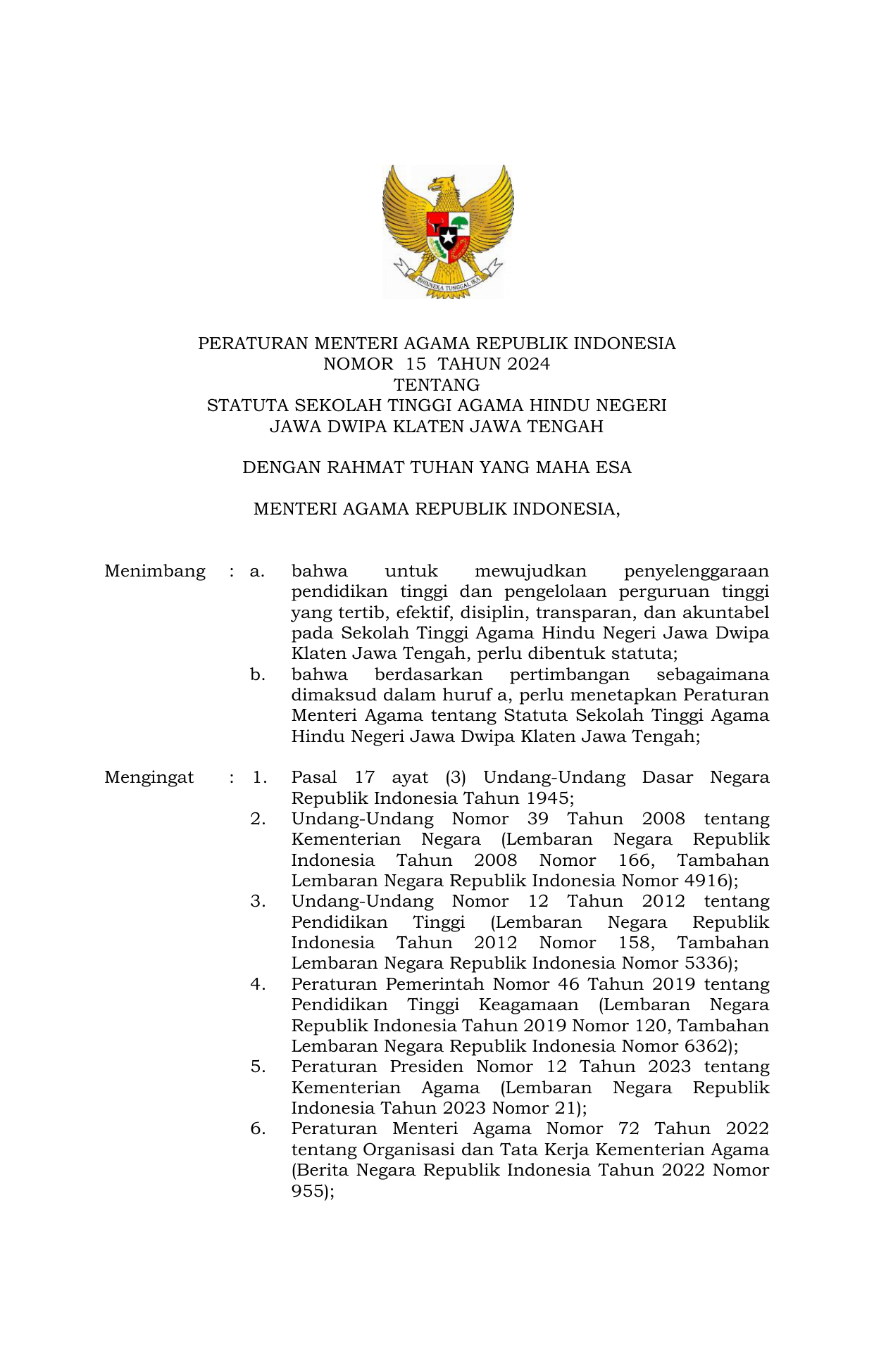 PERMEN Nomor 15 Tahun 2024 | Peraturan Menteri Nomor 15 Tahun 2024 tentang Statuta Sekolah Tinggi Agama Hindu Negeri Jawa Dwipa Klaten Jawa Tengah