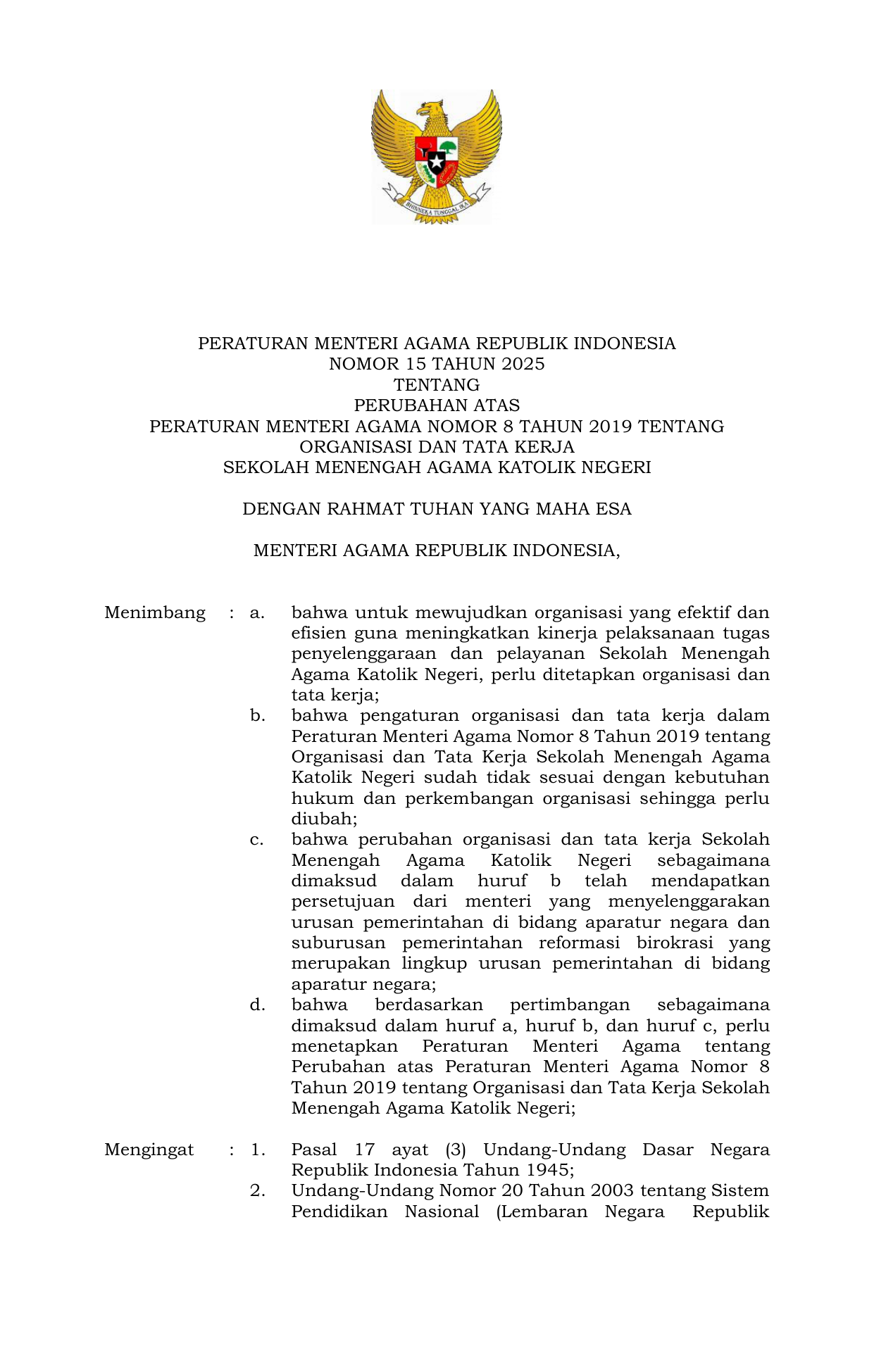 PERMEN Nomor 15 Tahun 2025 | Peraturan Menteri Nomor 15 Tahun 2025 tentang Organisasi dan Tata Kerja Sekolah Menengah Agama Katolik Negeri