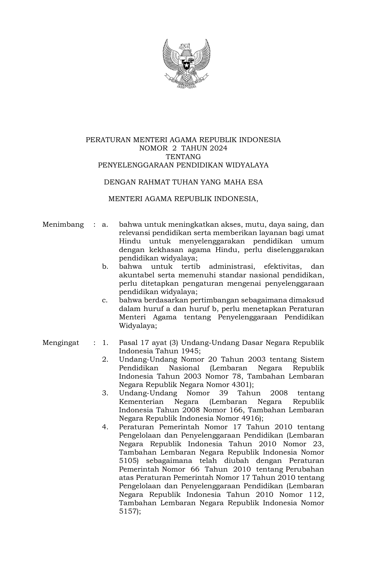 PERMEN Nomor 2 Tahun 2024 | Peraturan Menteri Nomor 2 Tahun 2024 tentang PENYELENGGARAAN PENDIDIKAN WIDYALAYA