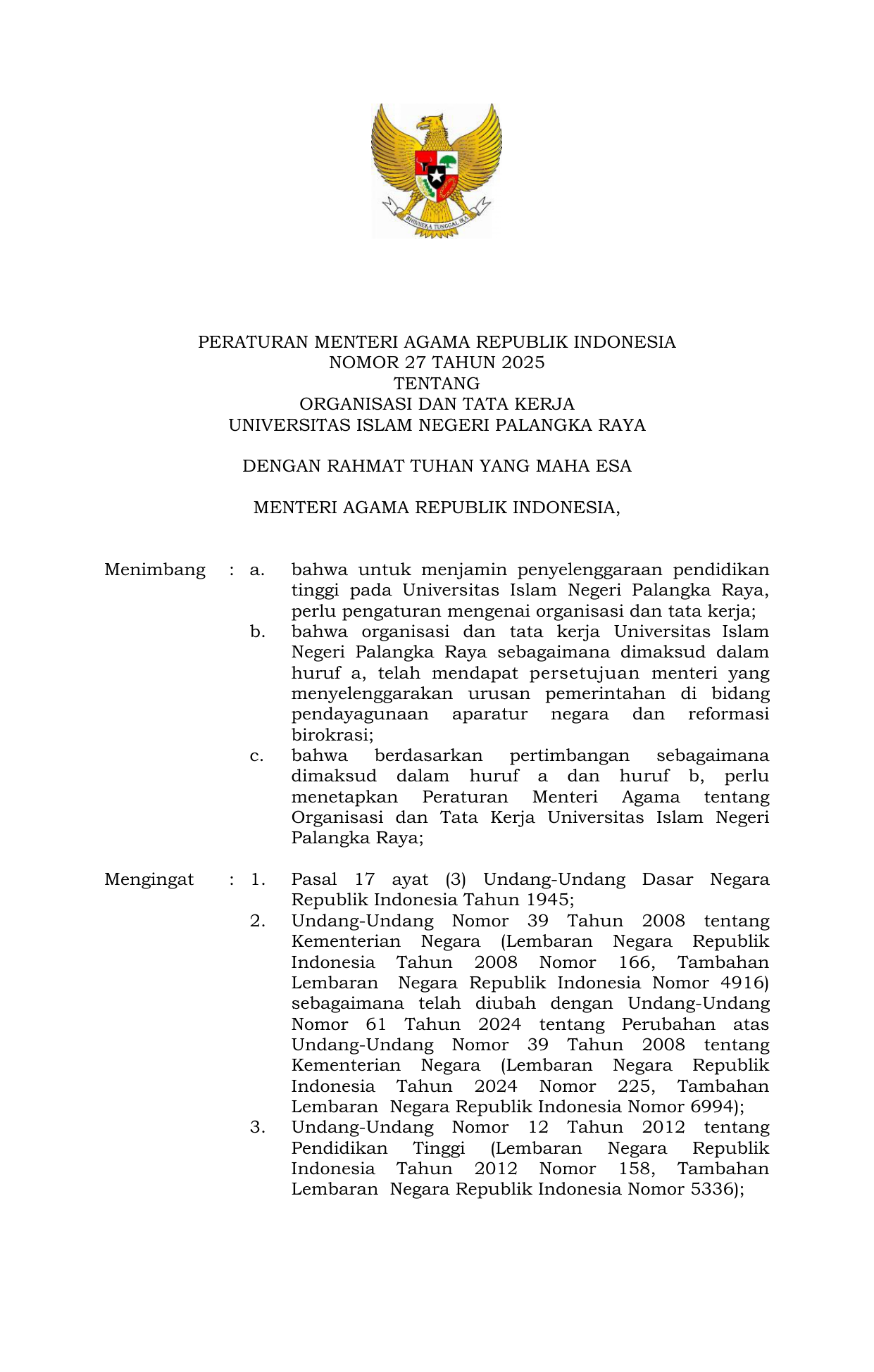 PERMEN Nomor 27 Tahun 2025 | Peraturan Menteri Nomor 27 Tahun 2025 tentang Organisasi dan Tata Kerja Universitas Islam Negeri Palangka Raya