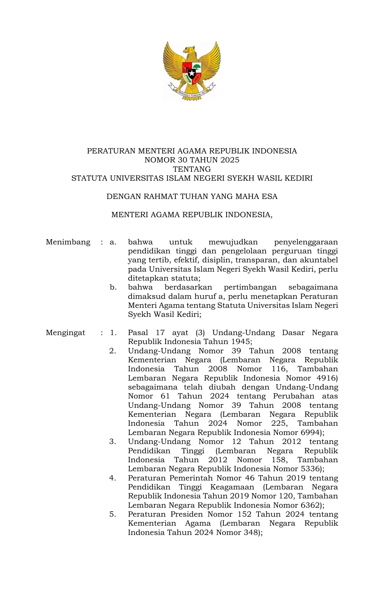 PERMEN Nomor 30 Tahun 2025 | Peraturan Menteri Nomor 30 Tahun 2025 tentang Statuta Universitas Islam Negeri Syekh Wasil Kediri