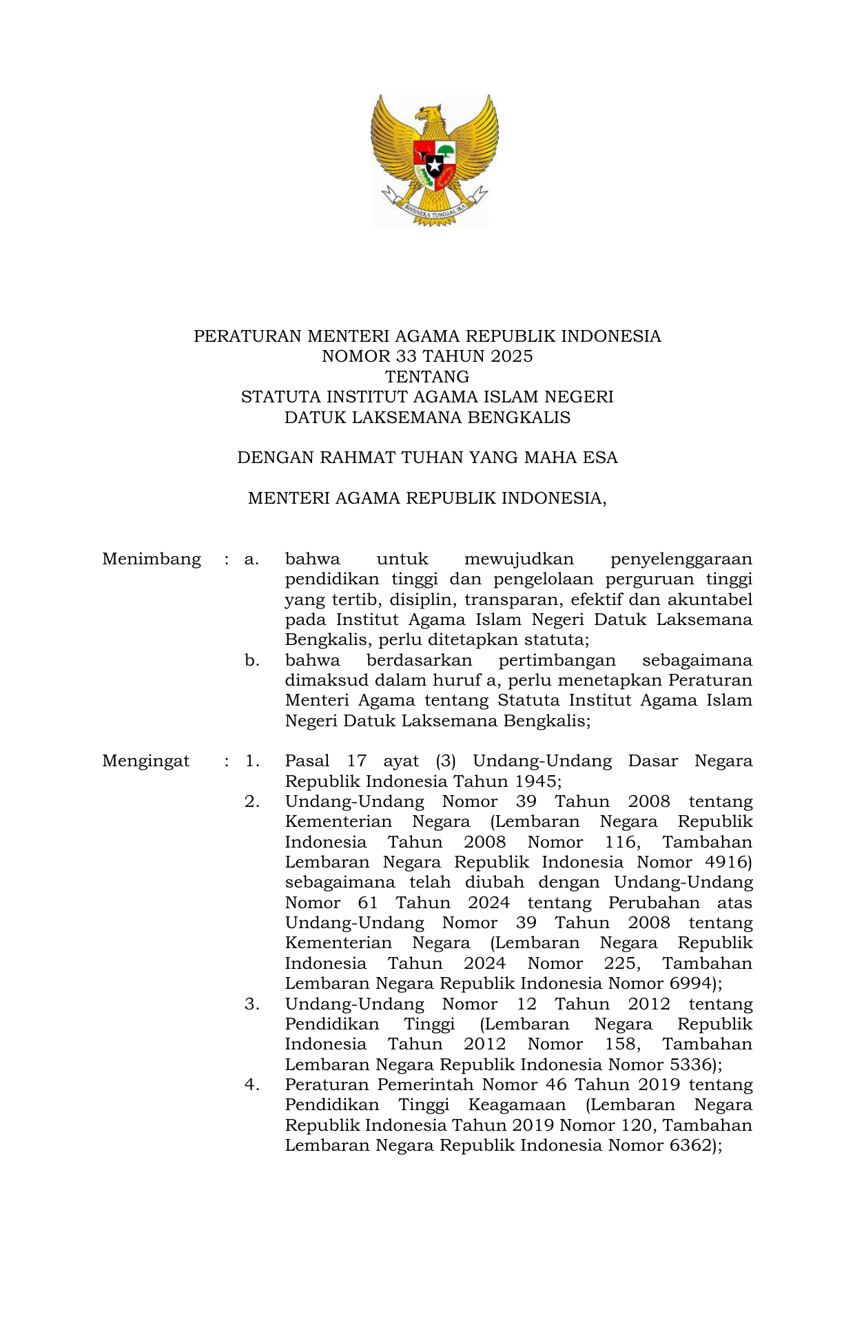 PERMEN Nomor 33 Tahun 2025 | Peraturan Menteri Nomor 33 Tahun 2025 tentang Statuta Institut Agama Islam Negeri Datuk Laksemana Bengkalis