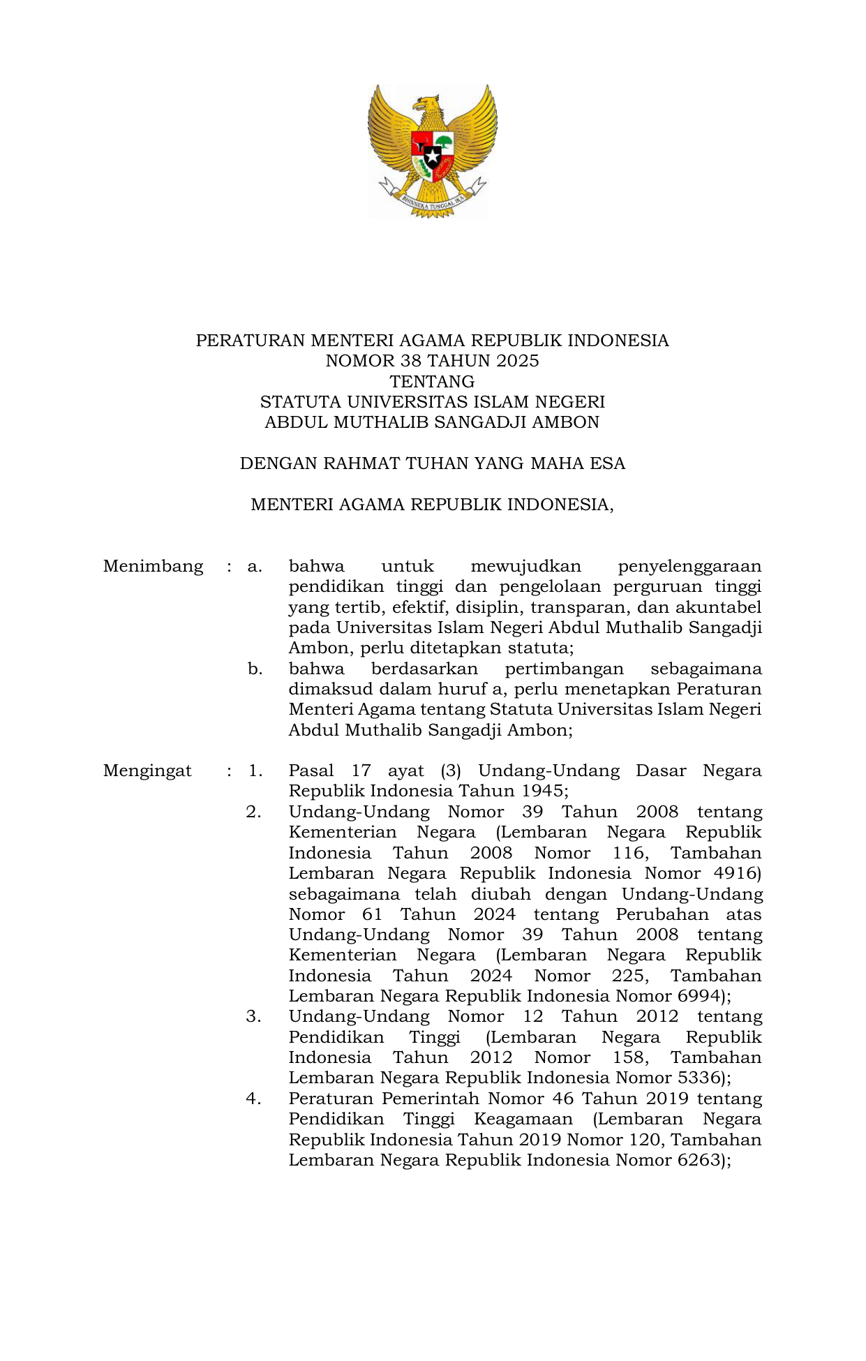 PERMEN Nomor 38 Tahun 2025 | Peraturan Menteri Nomor 38 Tahun 2025 tentang Statuta Universitas Islam Negeri Abdul Muthalib Sangadji Ambon