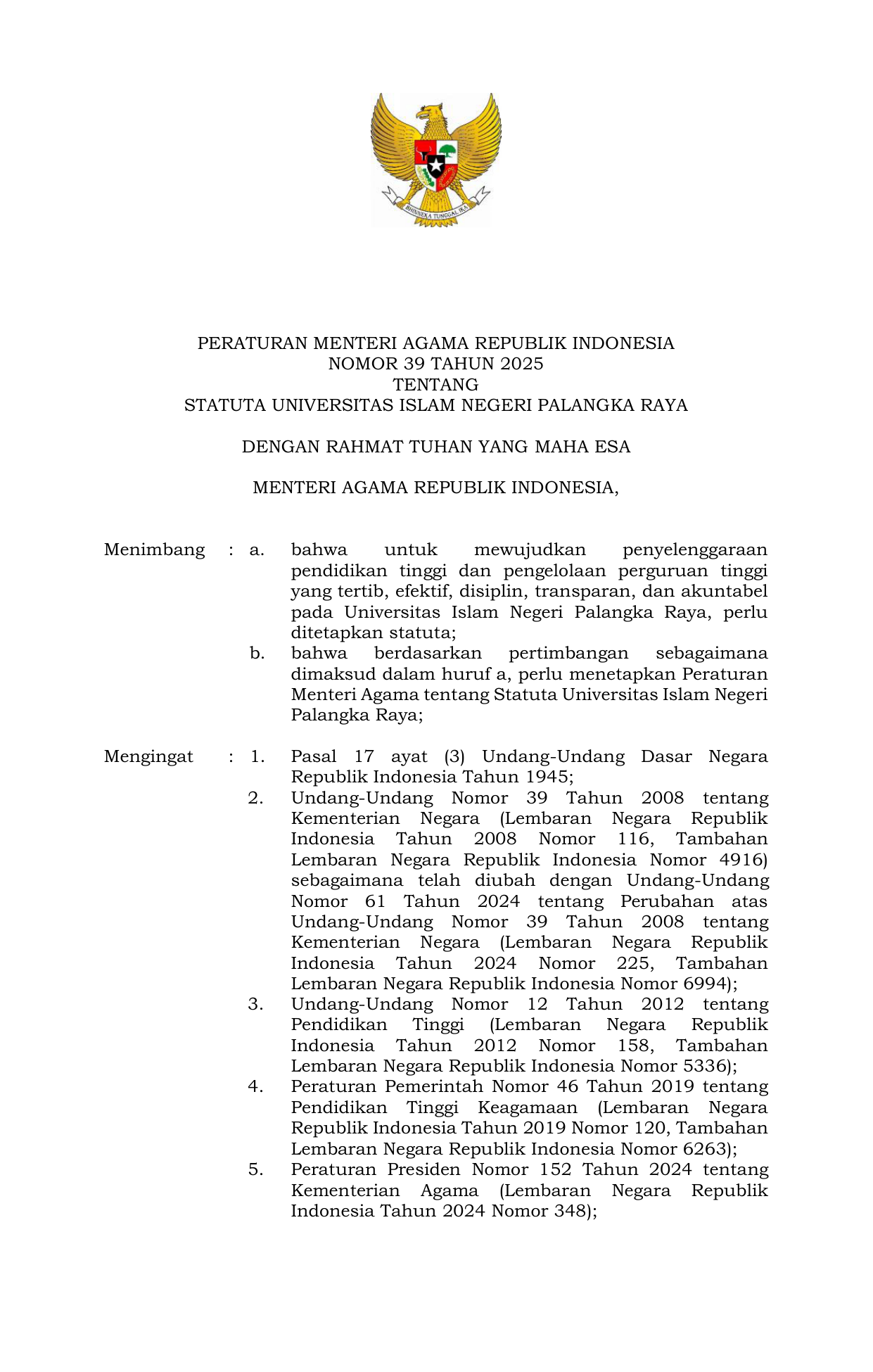 PERMEN Nomor 39 Tahun 2025 | Peraturan Menteri Nomor 39 Tahun 2025 tentang Statuta Universitas Islam Negeri Palangka Raya