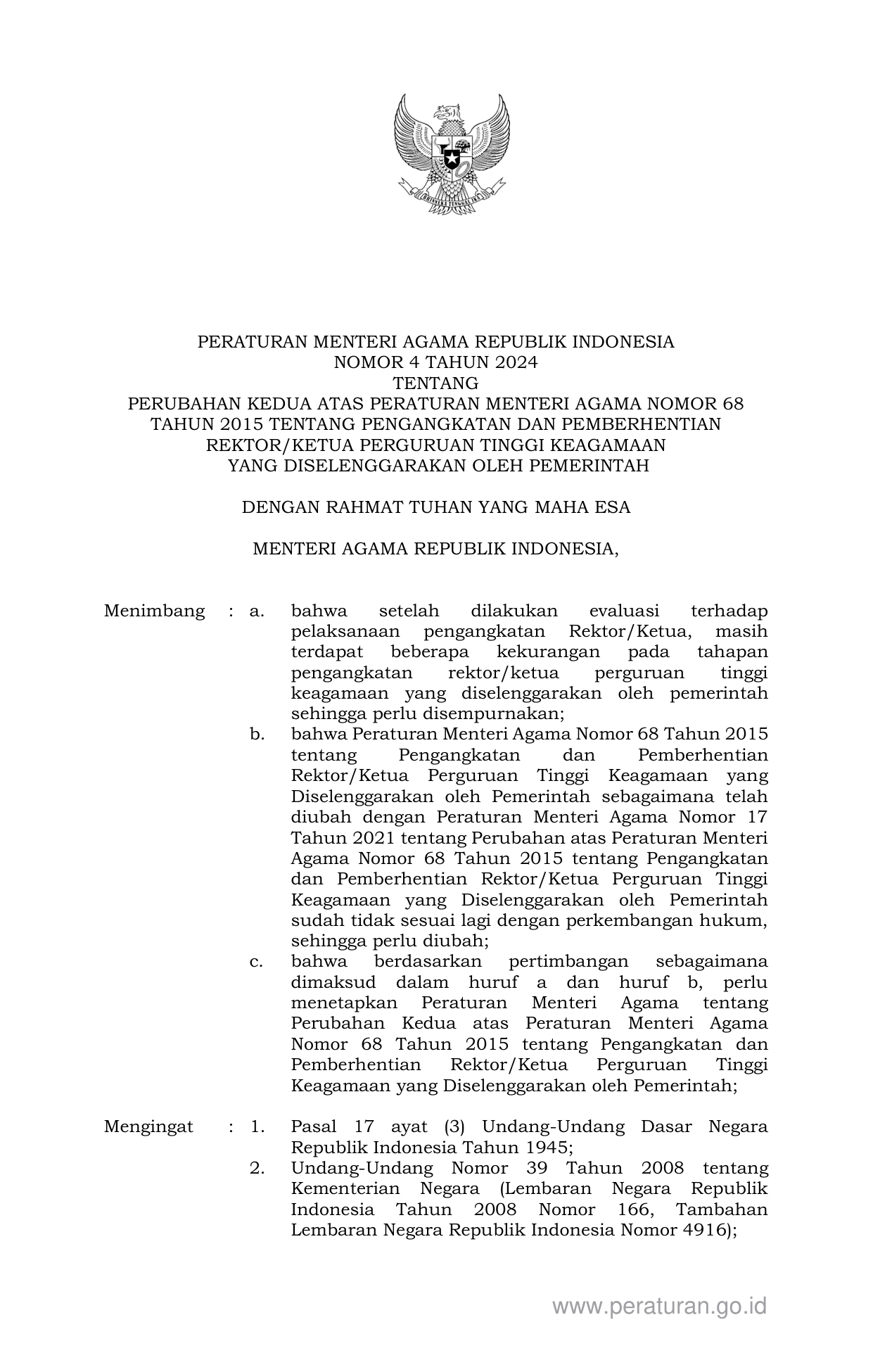 PERMEN Nomor 4 Tahun 2024 | Peraturan Menteri Nomor 4 Tahun 2024 tentang PERUBAHAN KEDUA ATAS PERATURAN MENTERI AGAMA NOMOR 68 TAHUN 2015 TENTANG PENGANGKATAN DAN PEMBERHENTIAN REKTOR/KETUA PERGURUAN TINGGI KEAGAMAAN YANG DISELENGGARAKAN OLEH PEMERINTAH