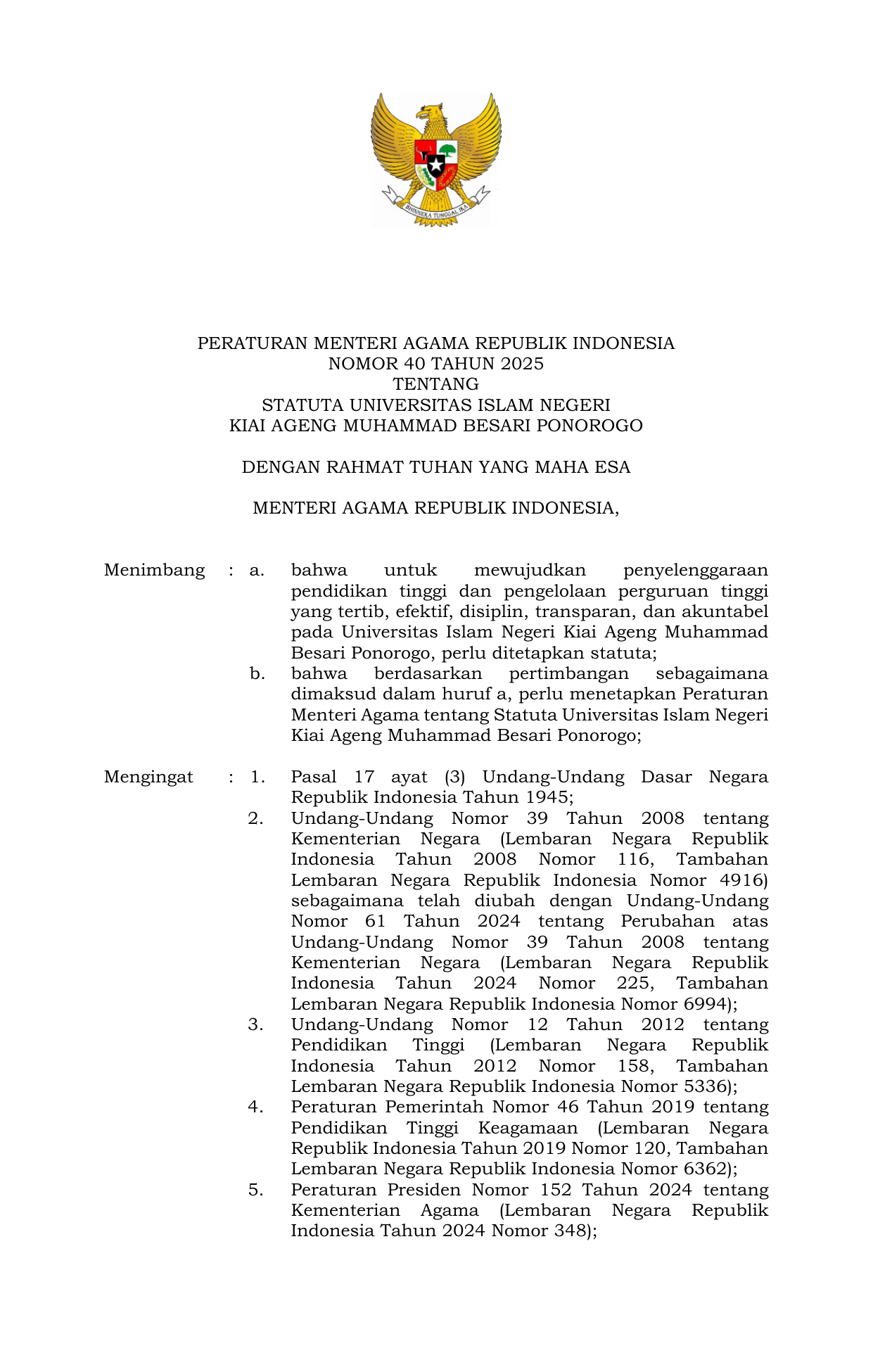 PERMEN Nomor 40 Tahun 2025 | Peraturan Menteri Nomor 40 Tahun 2025 tentang Statuta Universitas Islam Negeri Kiai Ageng Muhammad Besari Ponorogo