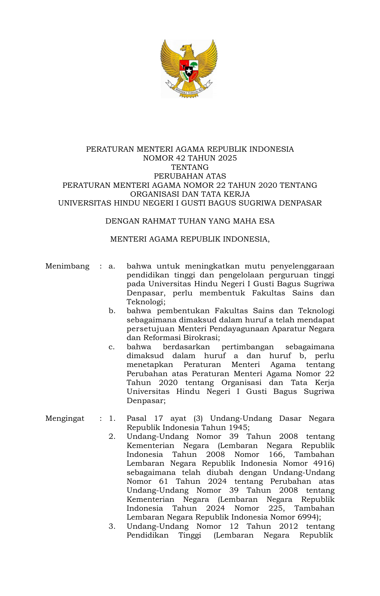 PERMEN Nomor 42 Tahun 2025 | Peraturan Menteri Nomor 42 Tahun 2025 tentang Perubahan atas Peraturan Menteri Agama Nomor 22 Tahun 2020 tentang Organisasi dan Tata Kerja Universitas Hindu Negeri I Gusti Bagus Sugriwa Denpasar