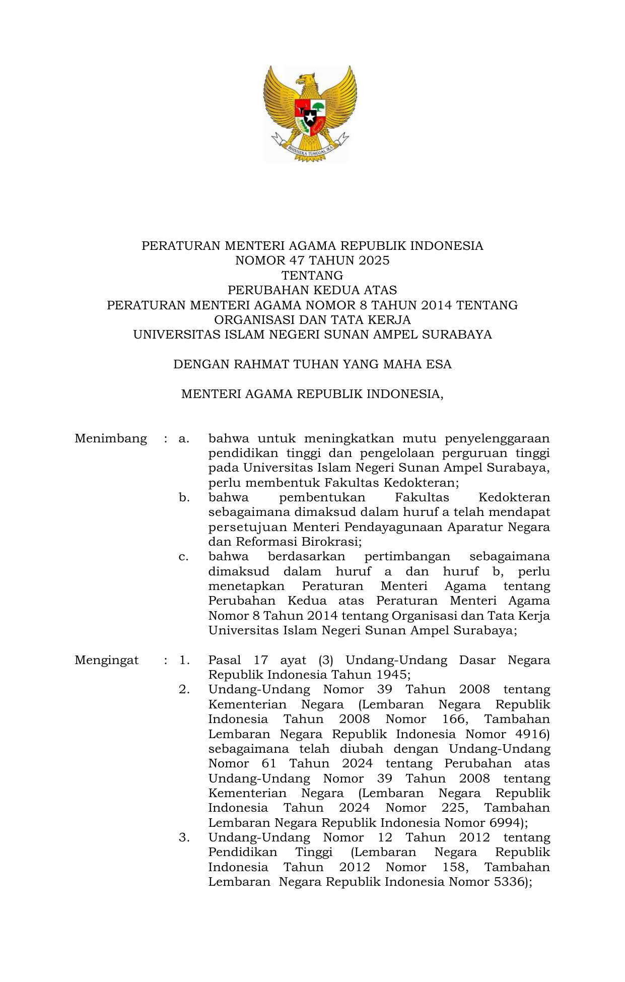 PERMEN Nomor 47 Tahun 2025 | Peraturan Menteri Nomor 47 Tahun 2025 tentang Perubahan Kedua atas Peraturan Menteri Agama Nomor 8 Tahun 2014 tentang Organisasi dan Tata Kerja Universitas Islam Negeri Sunan Ampel Surabaya