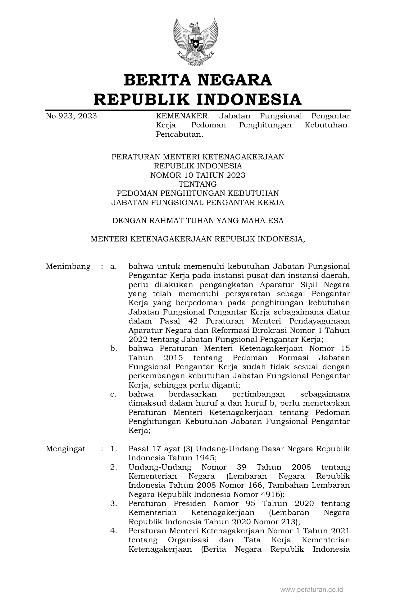 PERMEN Nomor 10 Tahun 2023 | Peraturan Menteri Nomor 10 Tahun 2023 tentang PEDOMAN PENGHITUNGAN KEBUTUHAN JABATAN FUNGSIONAL PENGANTAR KERJA