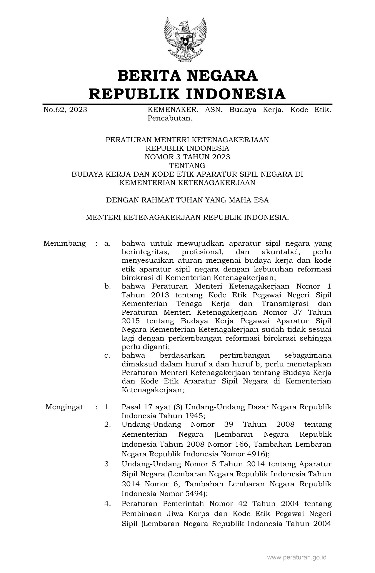 PERMEN Nomor 3 Tahun 2023 | Peraturan Menteri Nomor 3 Tahun 2023 tentang BUDAYA KERJA DAN KODE ETIK APARATUR SIPIL NEGARA DI KEMENTERIAN KETENAGAKERJAAN