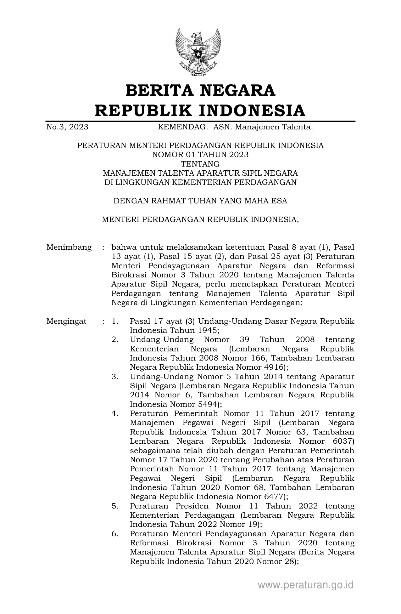 PERMEN Nomor 01 Tahun 2023 | Peraturan Menteri Nomor 01 Tahun 2023 tentang MANAJEMEN TALENTA APARATUR SIPIL NEGARA DI LINGKUNGAN KEMENTERIAN PERDAGANGAN