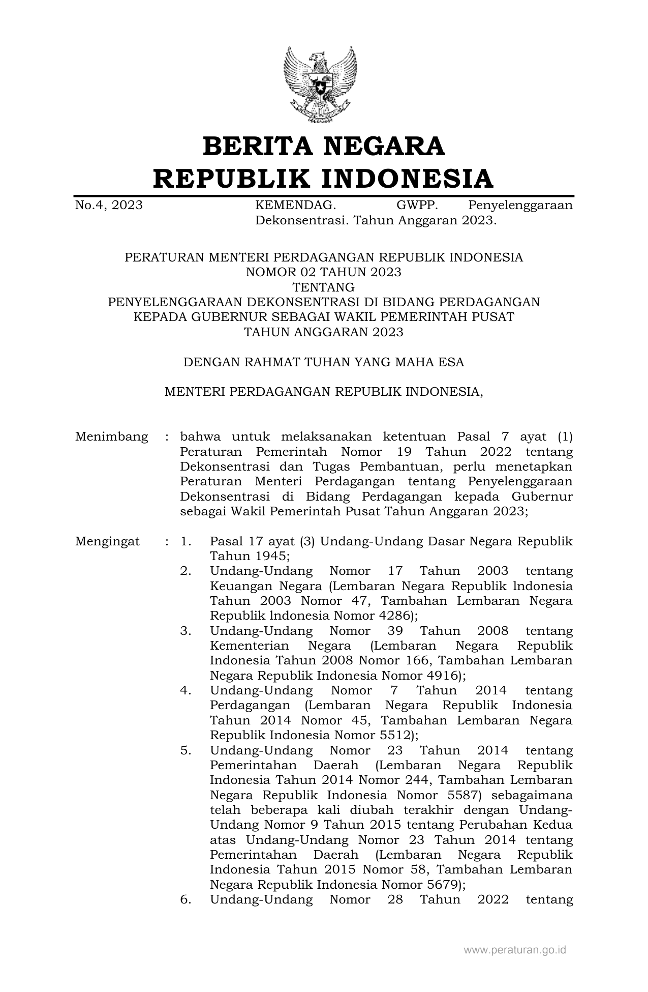 PERMEN Nomor 02 Tahun 2023 | Peraturan Menteri Nomor 02 Tahun 2023 tentang PENYELENGGARAAN DEKONSENTRASI DI BIDANG PERDAGANGAN KEPADA GUBERNUR SEBAGAI WAKIL PEMERINTAH PUSAT TAHUN ANGGARAN 2023