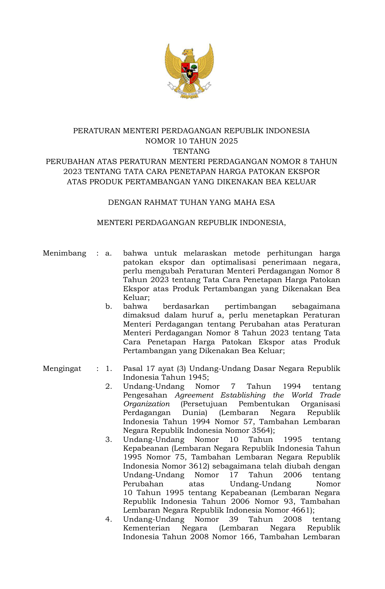 PERMEN Nomor 10 Tahun 2025 | Peraturan Menteri Nomor 10 Tahun 2025 tentang Perubahan atas Peraturan Menteri Perdagangan Nomor 8 Tahun 2023 tentang Tata Cara Penetapan Harga Patokan Ekspor atas Produk Pertambangan yang Dikenakan Bea Ekspor
