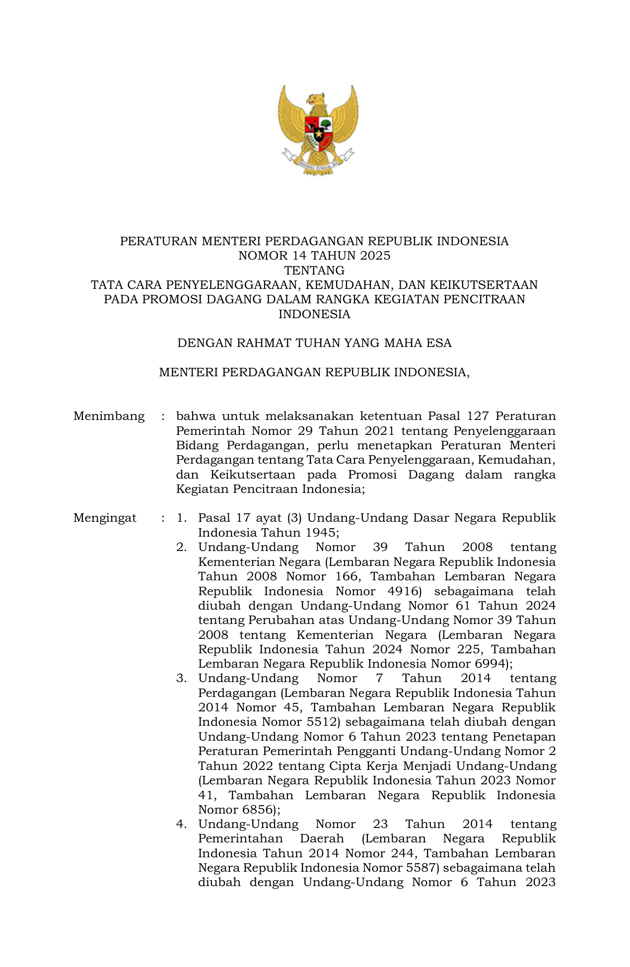 PERMEN Nomor 14 Tahun 2025 | Peraturan Menteri Nomor 14 Tahun 2025 tentang Tata Cara Penyelenggaraan Kemudahan dan Keikutsertaan pada Promosi Dagang dalam Rangka Kegiatan Pencitraan Indonesia