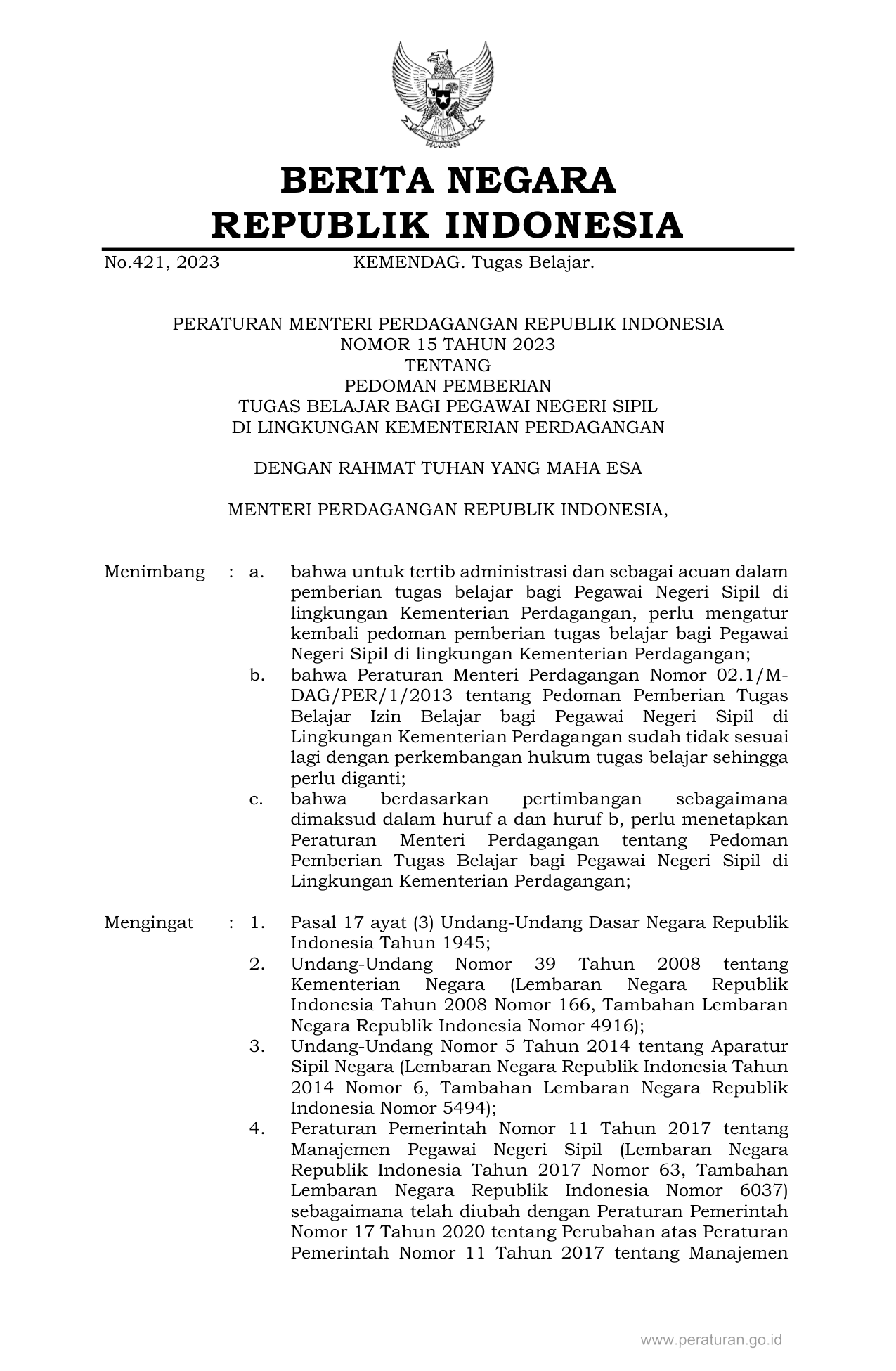 PERMEN Nomor 15 Tahun 2023 | Peraturan Menteri Nomor 15 Tahun 2023 tentang PEDOMAN PEMBERIAN TUGAS BELAJAR BAGI PEGAWAI NEGERI SIPIL DI LINGKUNGAN KEMENTERIAN PERDAGANGAN