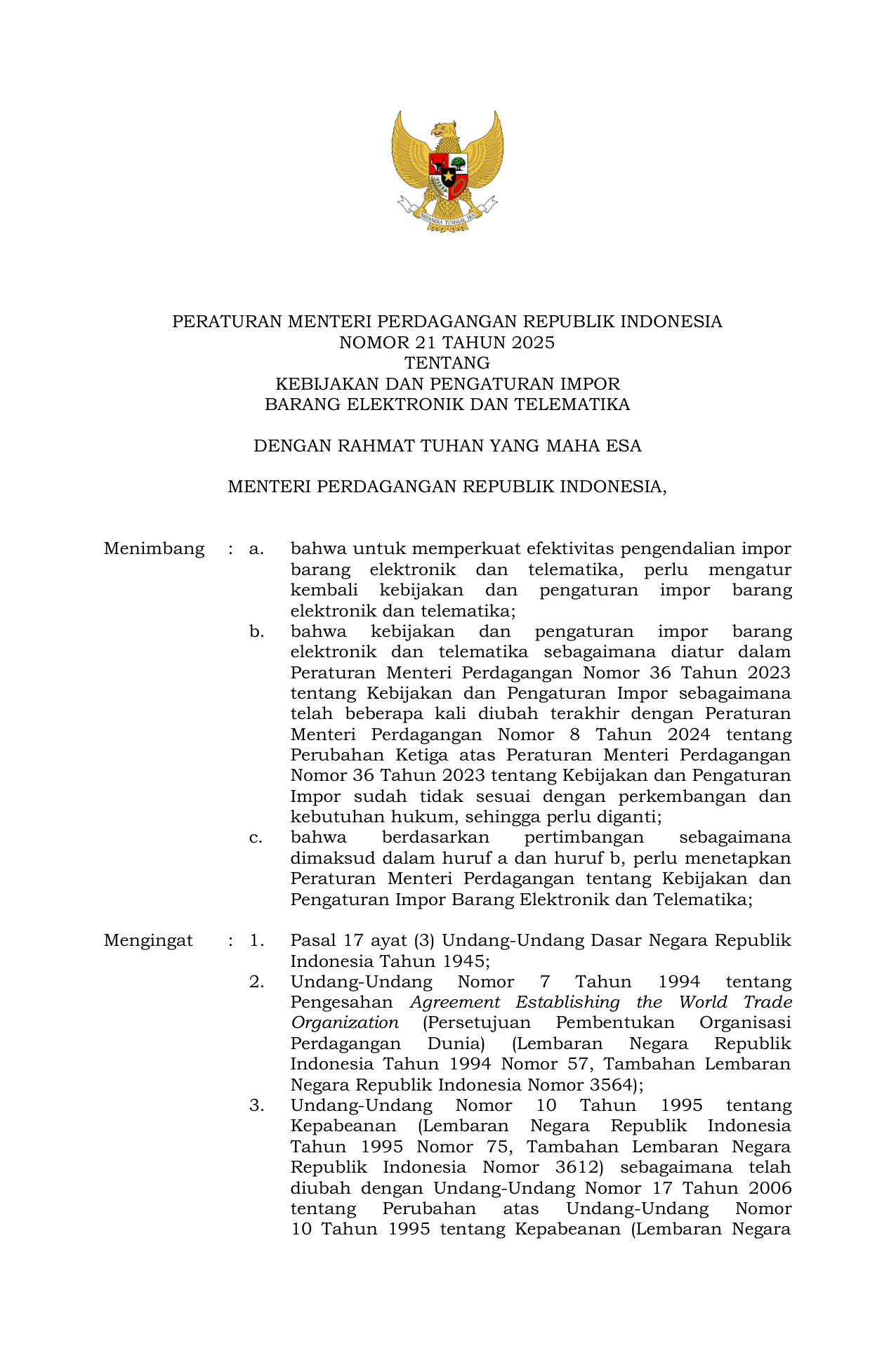 PERMEN Nomor 21 Tahun 2025 | Peraturan Menteri Nomor 21 Tahun 2025 tentang Kebijakan dan Pengaturan Impor Barang Elektronik dan Telematika