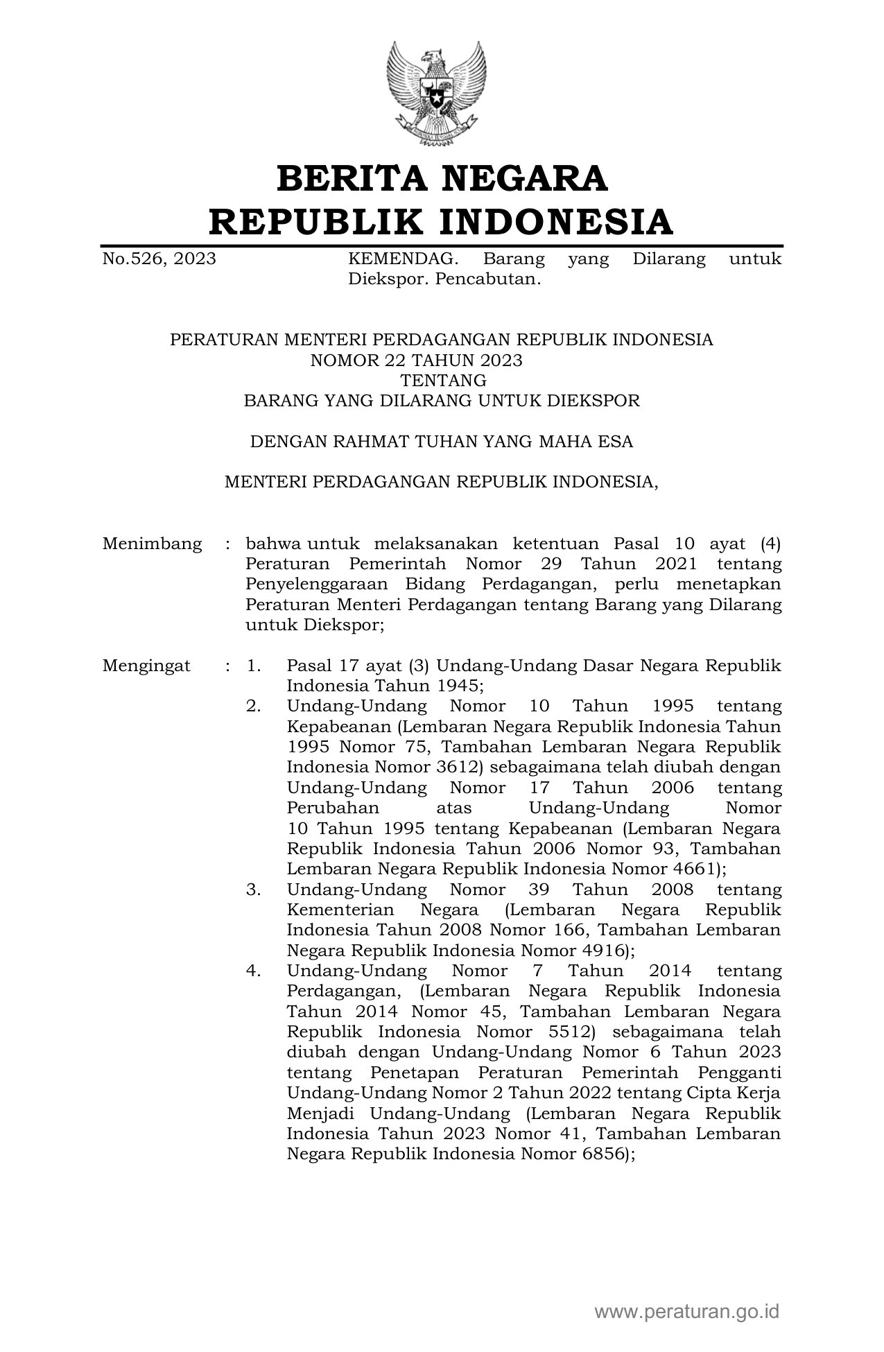 PERMEN Nomor 22 Tahun 2023 | Peraturan Menteri Nomor 22 Tahun 2023 tentang BARANG YANG DILARANG UNTUK DIEKSPOR