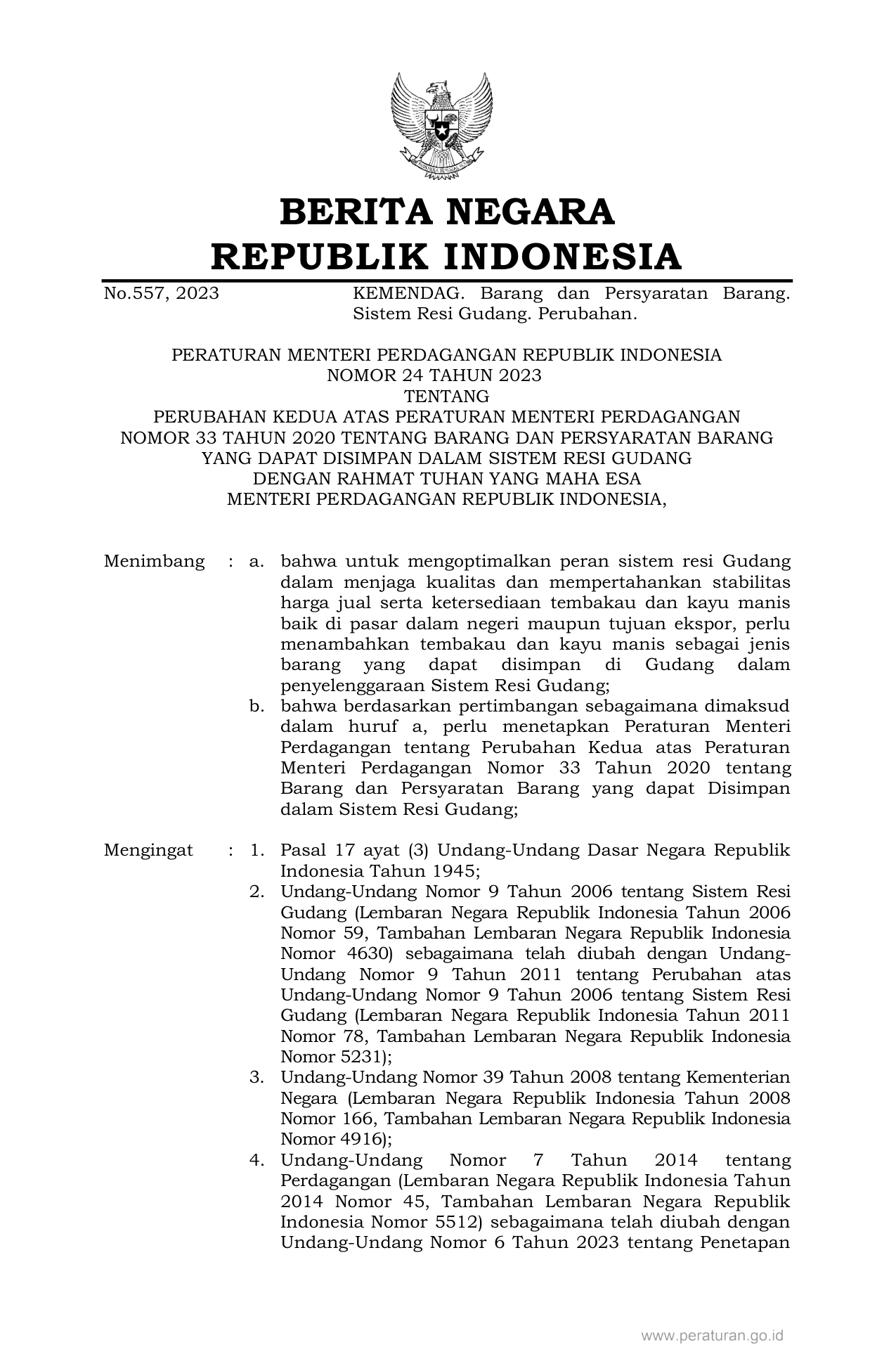 PERMEN Nomor 24 Tahun 2023 | Peraturan Menteri Nomor 24 Tahun 2023 tentang PERUBAHAN KEDUA ATAS PERATURAN MENTERI PERDAGANGAN NOMOR 33 TAHUN 2020 TENTANG BARANG DAN PERSYARATAN BARANG YANG DAPAT DISIMPAN DALAM SISTEM RESI GUDANG