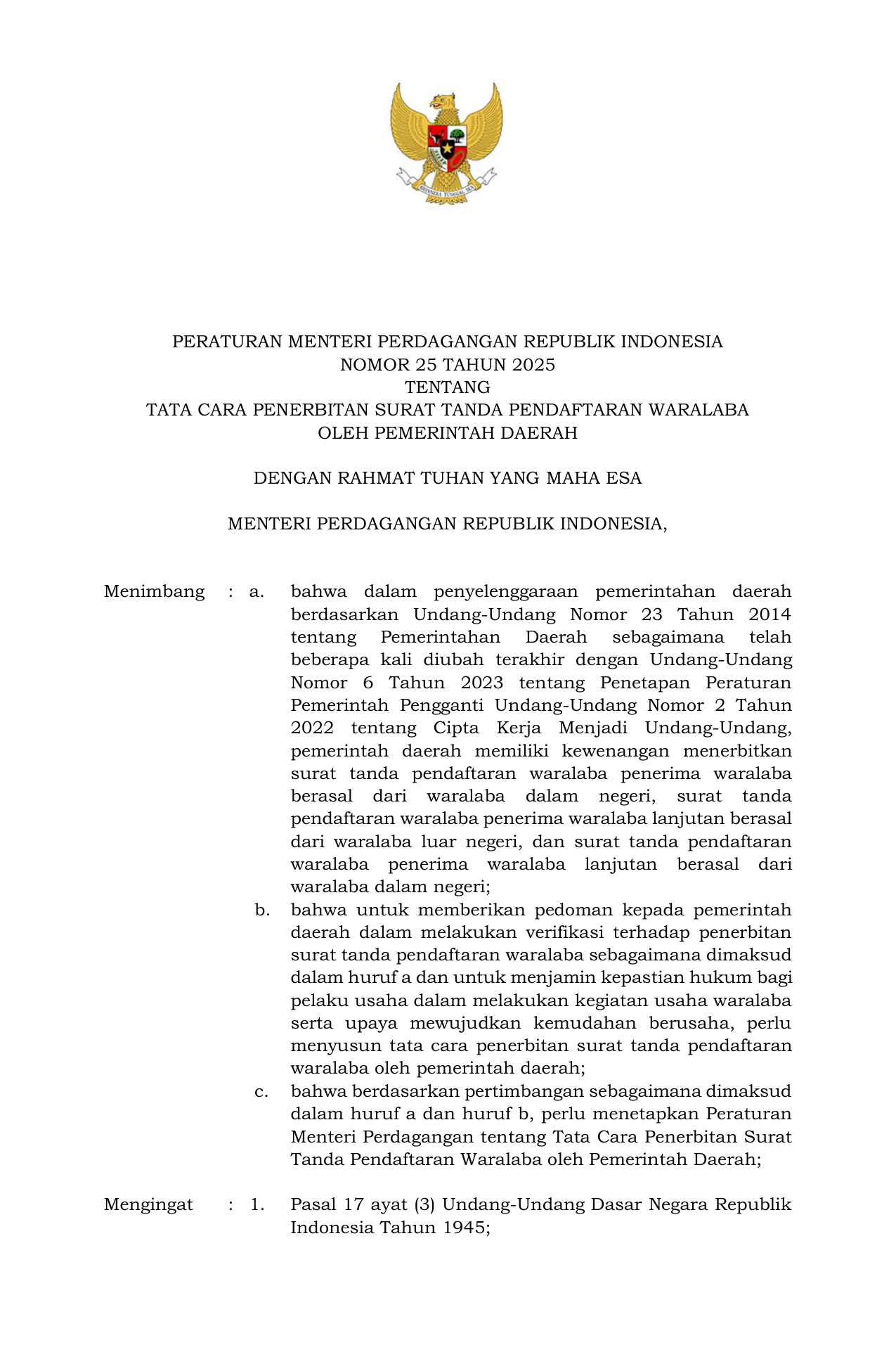PERMEN Nomor 25 Tahun 2025 | Peraturan Menteri Nomor 25 Tahun 2025 tentang Tata Cara Penerbitan Surat Tanda Pendaftaran Waralaba Oleh Pemerintah Daerah