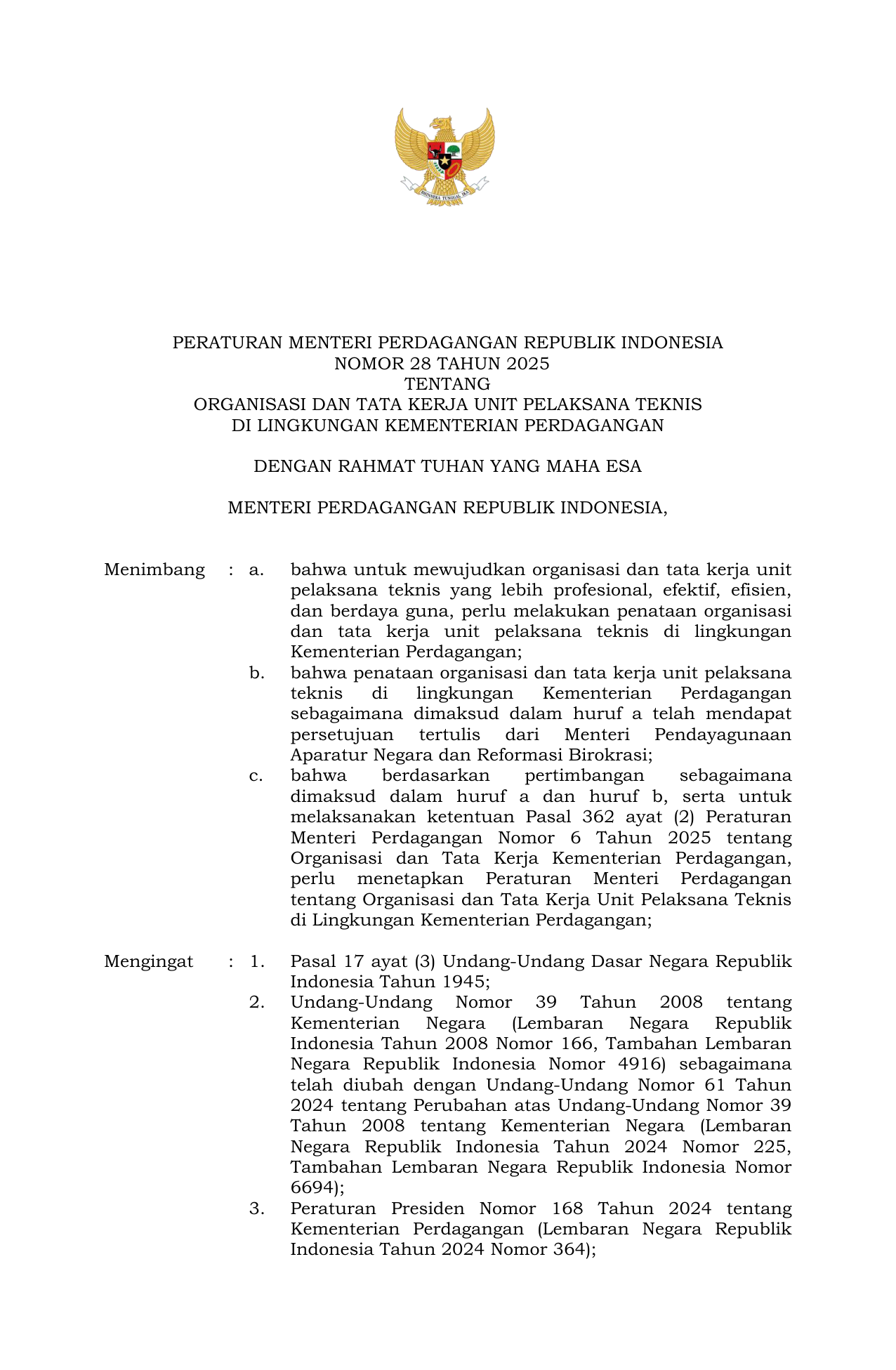 PERMEN Nomor 28 Tahun 2025 | Peraturan Menteri Nomor 28 Tahun 2025 tentang Organisasi dan Tata Kerja Unit Pelaksana Teknis di Lingkungan Kementerian Perdagangan