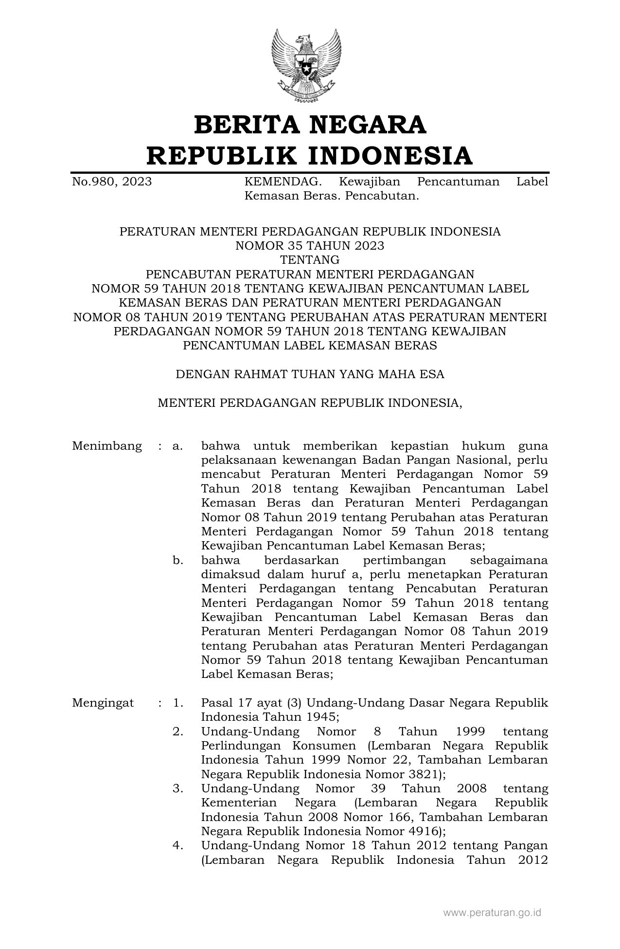 PERMEN Nomor 35 Tahun 2023 | Peraturan Menteri Nomor 35 Tahun 2023 tentang PENCABUTAN PERATURAN MENTERI PERDAGANGAN NOMOR 59 TAHUN 2018 TENTANG KEWAJIBAN PENCANTUMAN LABEL KEMASAN BERAS DAN PERATURAN MENTERI PERDAGANGAN NOMOR 08 TAHUN 2019 TENTANG PERUBAHAN ATAS PERATURAN MENTERI PERDAGANGAN NOMOR 59 TAHUN 2018 TENTANG KEWAJIBAN PENCANTUMAN LABEL KEMASAN BERAS