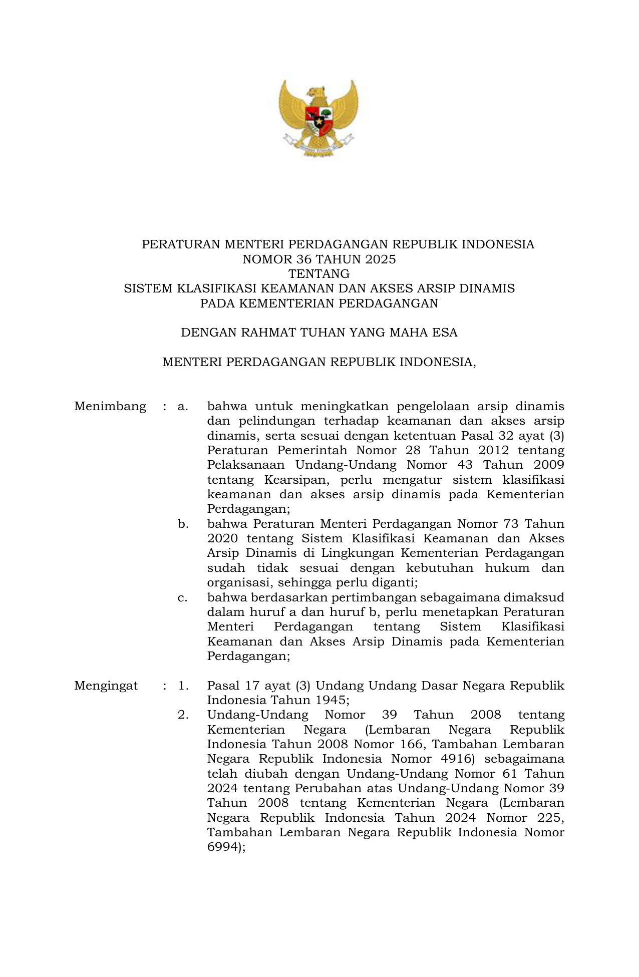 NOMOR 36 TAHUN 2025 TENTANG SISTEM KLASIFIKASI KEAMANAN DAN AKSES ARSIP PADA KEMENTERIAN PERDAGANGAN