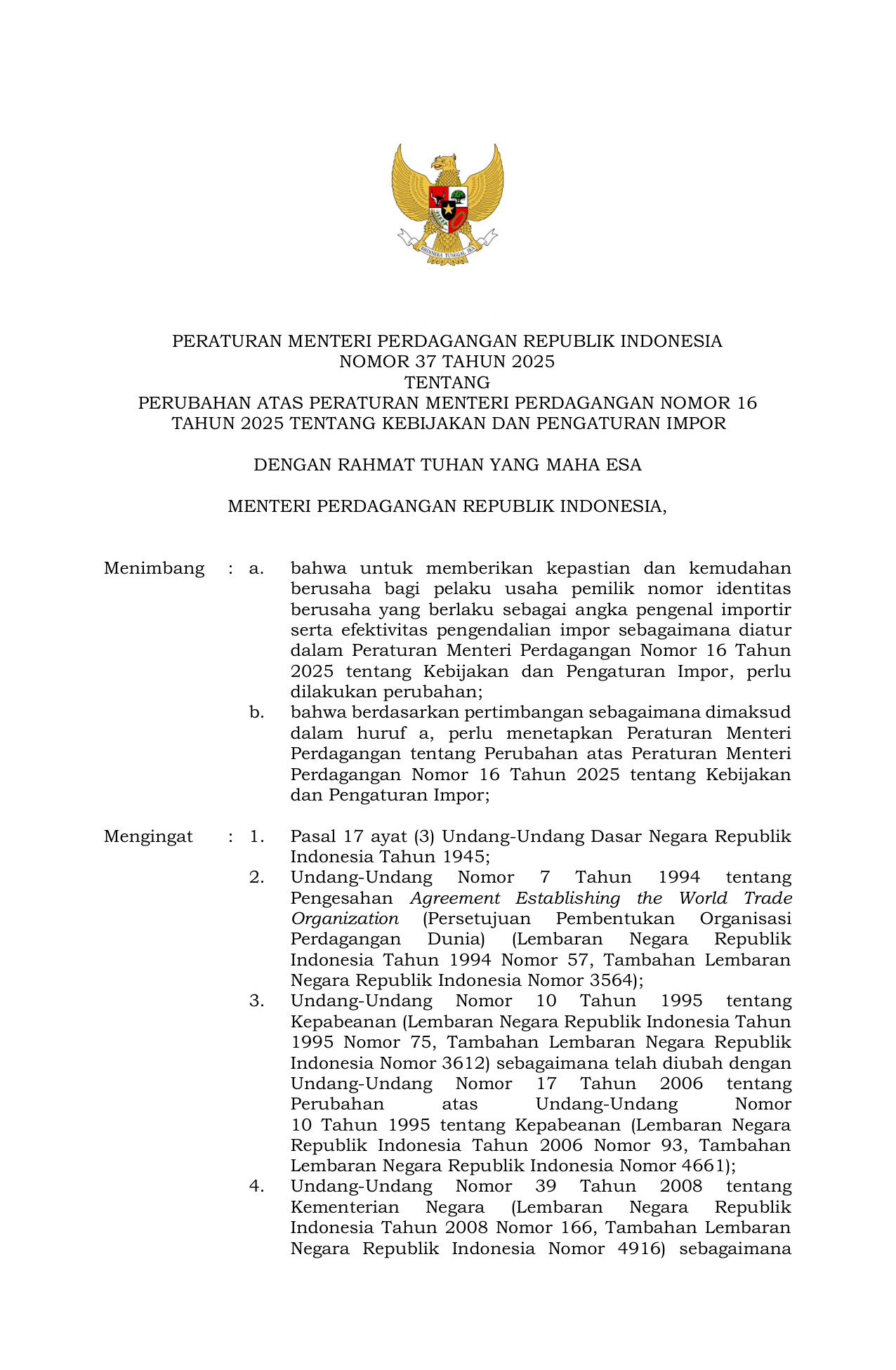 PERMEN Nomor 37 Tahun 2025 | Peraturan Menteri Nomor 37 Tahun 2025 tentang Perubahan atas Peraturan Menteri Perdagangan Nomor 16 Tahun 2025 tentang Kebijakan dan Pengaturan Impor