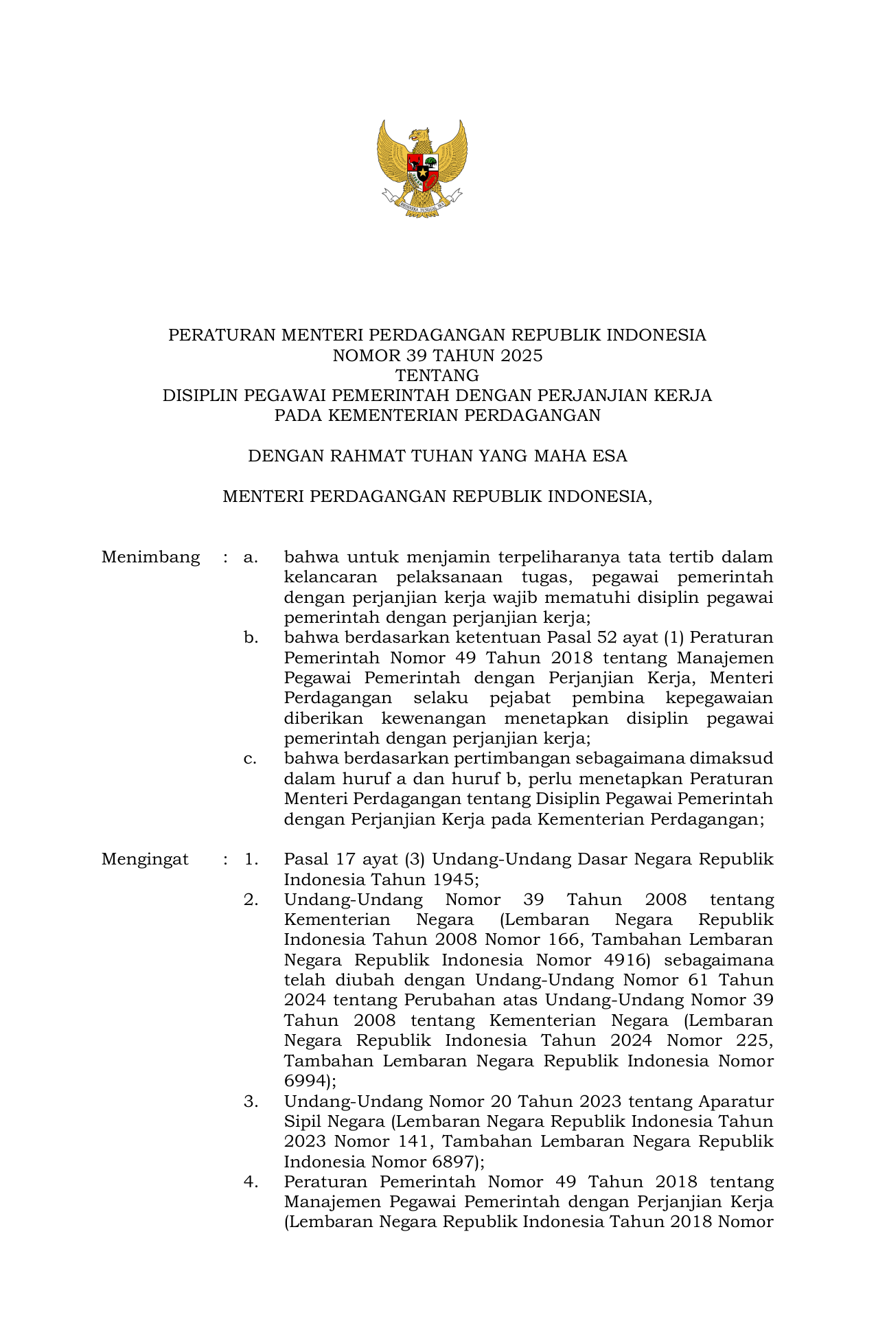 PERMEN Nomor 39 Tahun 2025 | Peraturan Menteri Nomor 39 Tahun 2025 tentang Disiplin Pegawai Pemerintah dengan Perjanjian Kerja pada Kementerian Perdagangan