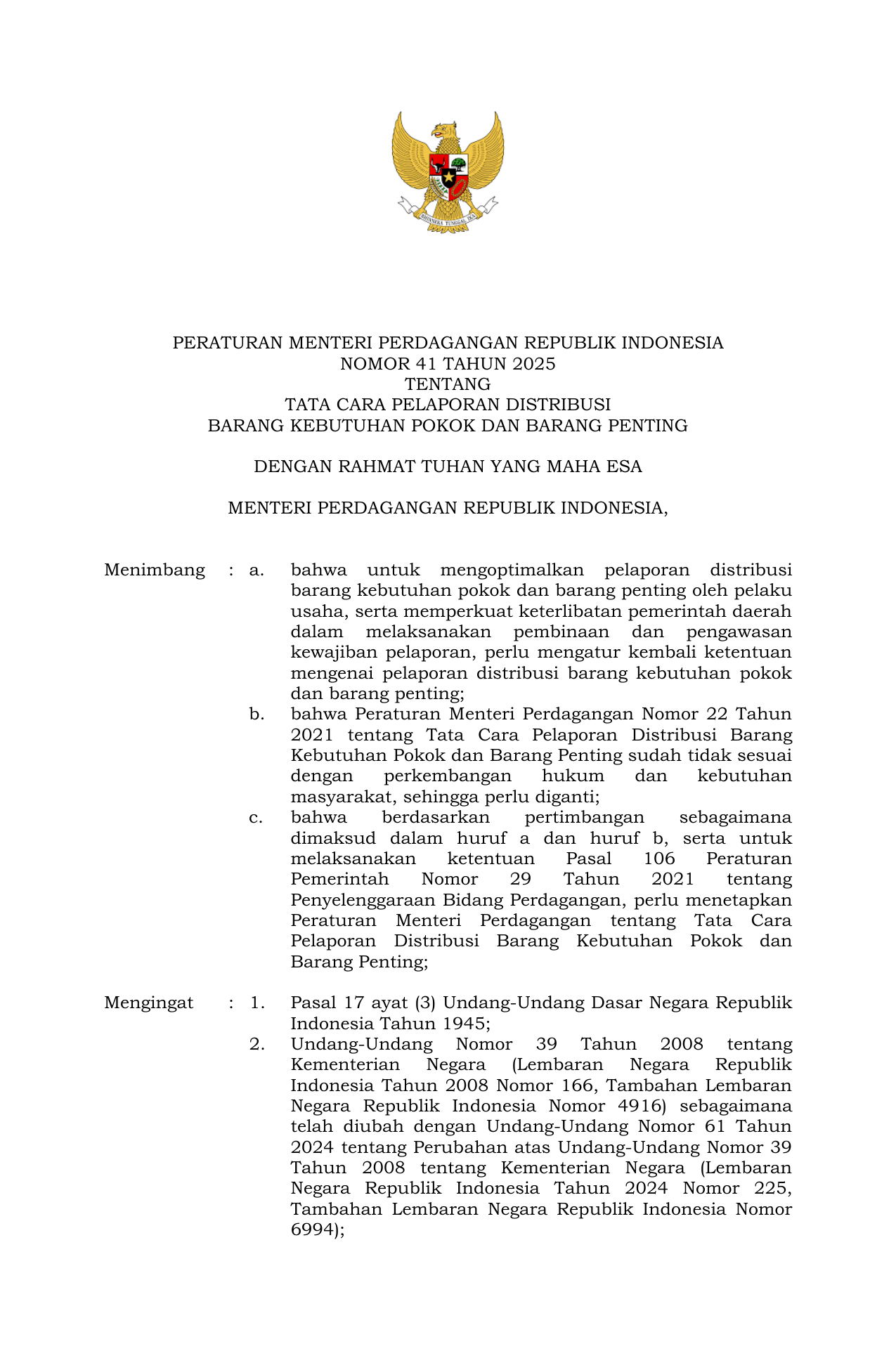PERMEN Nomor 41 Tahun 2025 | Peraturan Menteri Nomor 41 Tahun 2025 tentang Tata Cara Pelaporan Distribusi Barang Kebutuhan Pokok dan Barang Penting