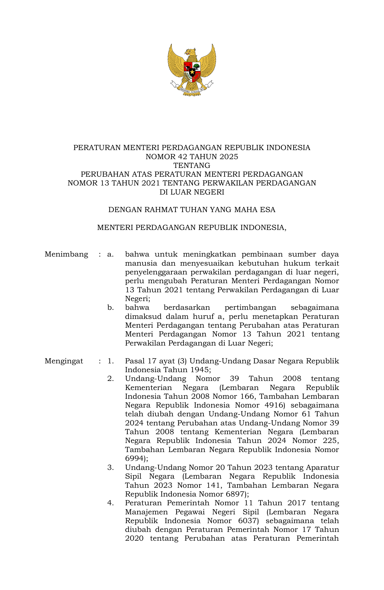 PERMEN Nomor 42 Tahun 2025 | Peraturan Menteri Nomor 42 Tahun 2025 tentang Perubahan atas Peraturan Menteri Perdagangan Nomor 13 Tahun 2021 tentang Perwakilan Perdagangan di Luar Negeri