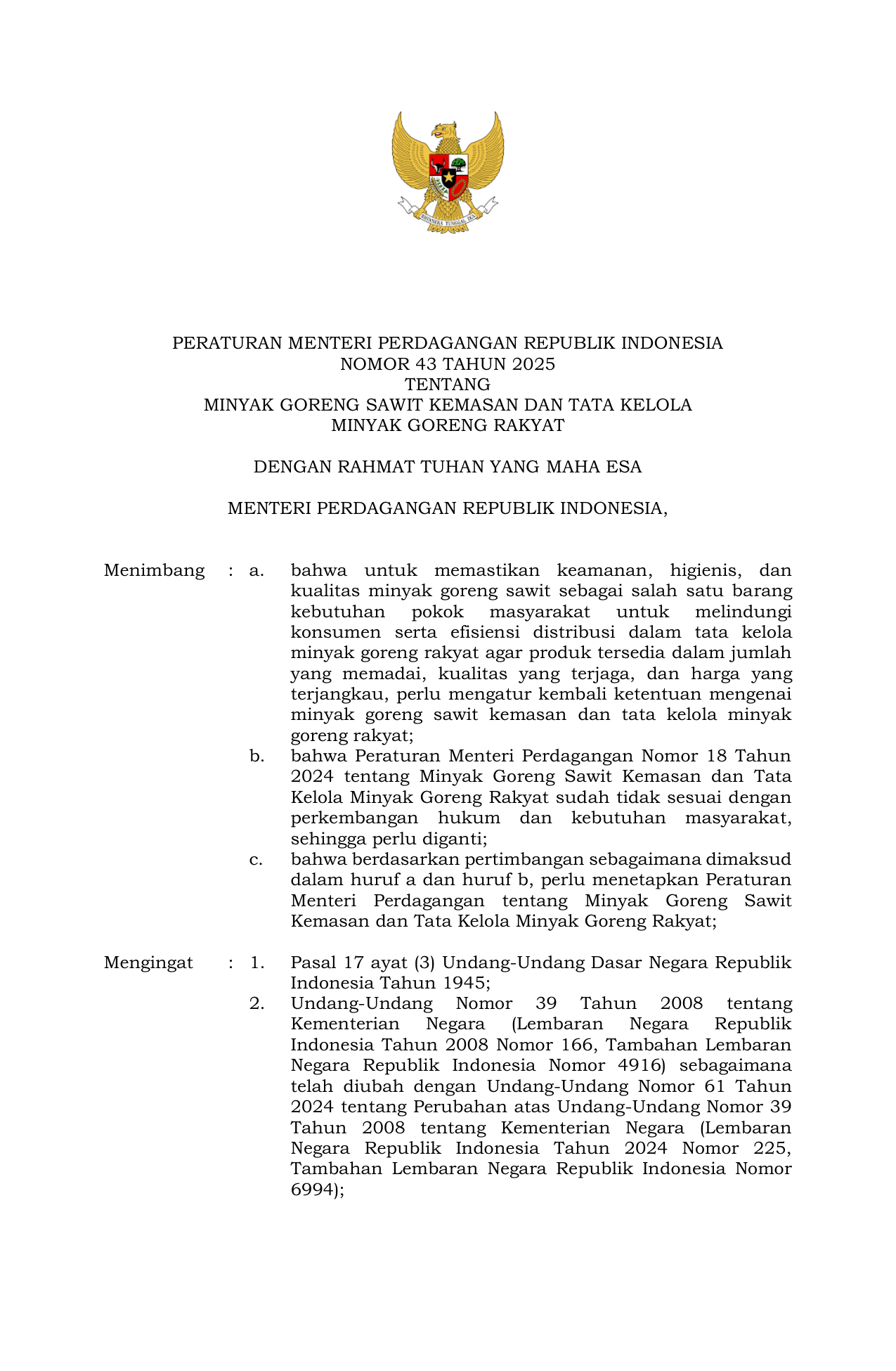 PERMEN Nomor 43 Tahun 2025 | Peraturan Menteri Nomor 43 Tahun 2025 tentang Minyak Goreng Sawit Kemasan dan Tata Kelola Minyak Goreng Rakyat
