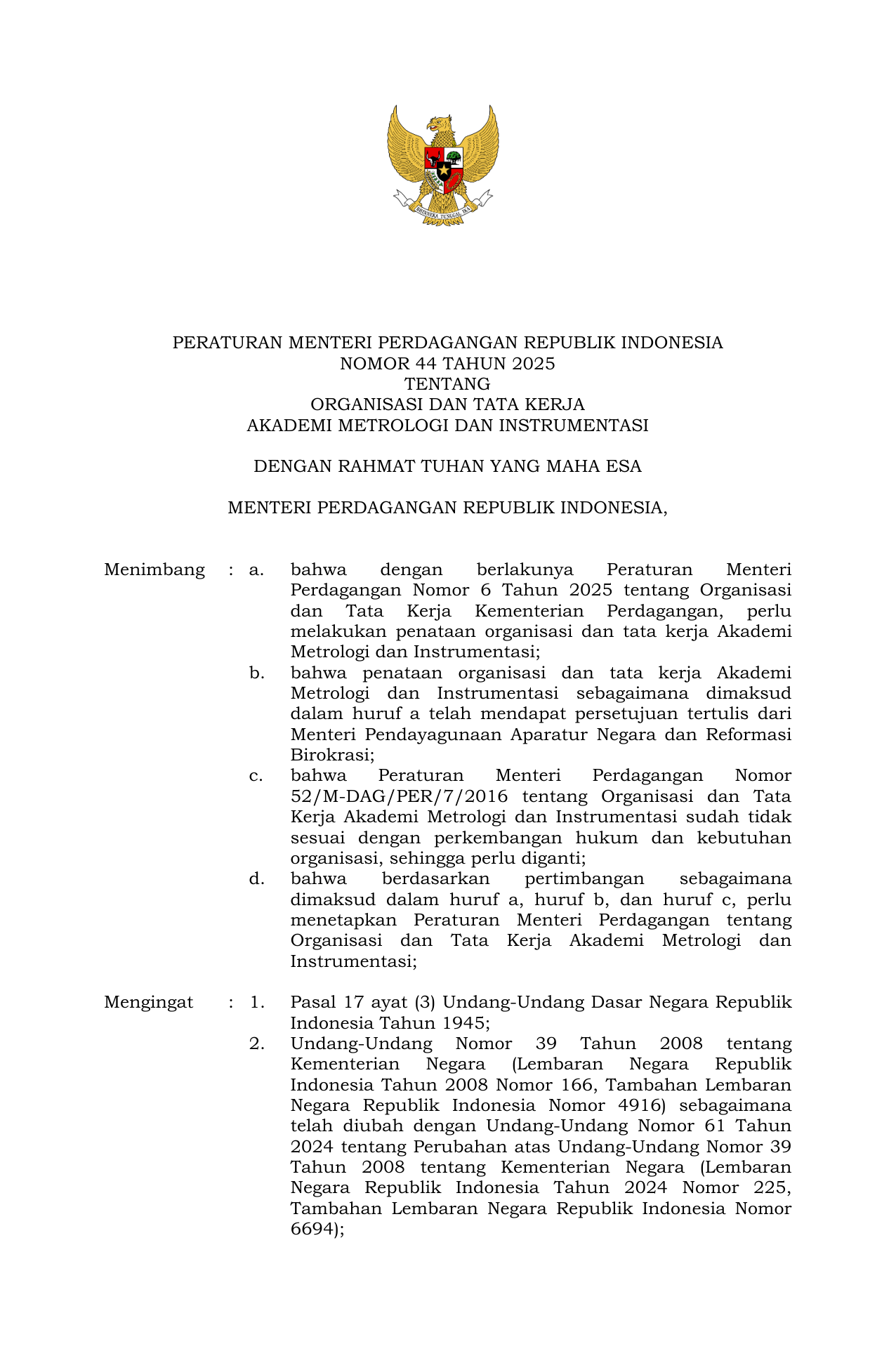 PERMEN Nomor 44 Tahun 2025 | Peraturan Menteri Nomor 44 Tahun 2025 tentang Organisasi dan Tata Kerja Akademi Metrologi dan Instrumentasi