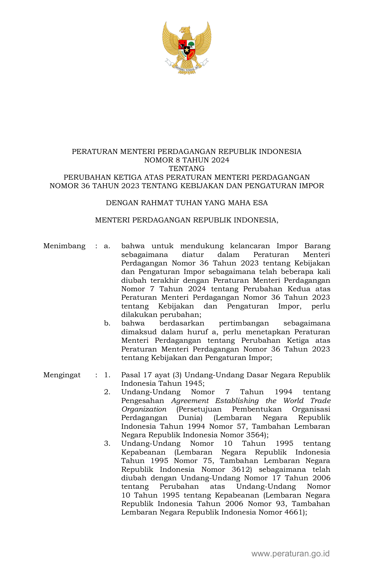 PERMEN Nomor 8 Tahun 2024 | Peraturan Menteri Nomor 8 Tahun 2024 tentang PERUBAHAN KETIGA ATAS PERATURAN MENTERI PERDAGANGAN NOMOR 36 TAHUN 2023 TENTANG KEBIJAKAN DAN PENGATURAN IMPOR