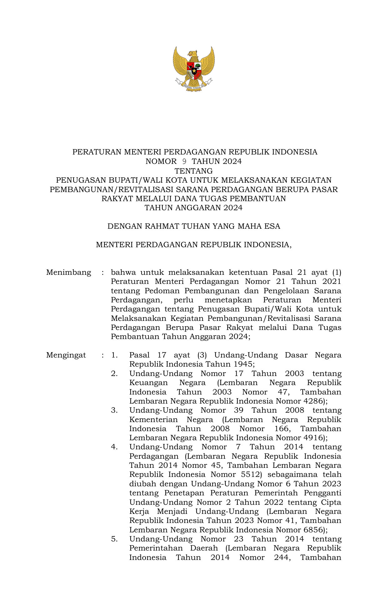 PERMEN Nomor 9 Tahun 2024 | Peraturan Menteri Nomor 9 Tahun 2024 tentang Penugasan Bupati/Wali Kota dalam Rangka Pelaksanaan Kegiatan Pembangunan/Revitalisasi Sarana Perdagangan Berupa Pasar Rakyat Melalui Dana Tugas Pembantuan Tahun Anggaran 2024