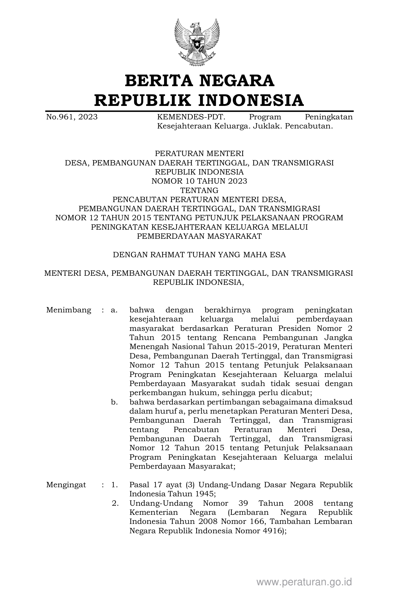 PERMEN Nomor 10 Tahun 2023 | Peraturan Menteri Nomor 10 Tahun 2023 tentang PENCABUTAN PERATURAN MENTERI DESA, PEMBANGUNAN DAERAH TERTINGGAL, DAN TRANSMIGRASI NOMOR 12 TAHUN 2015 TENTANG PETUNJUK PELAKSANAAN PROGRAM PENINGKATAN KESEJAHTERAAN KELUARGA MELALUI PEMBERDAYAAN MASYARAKAT
